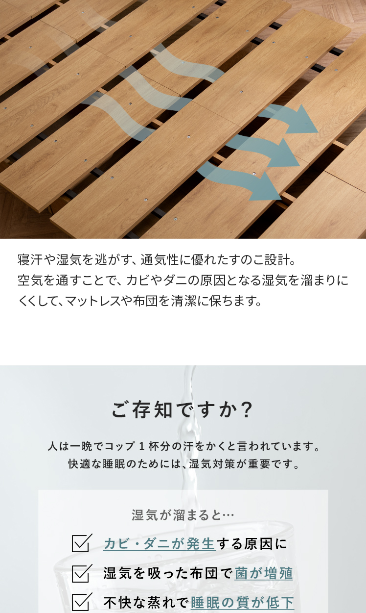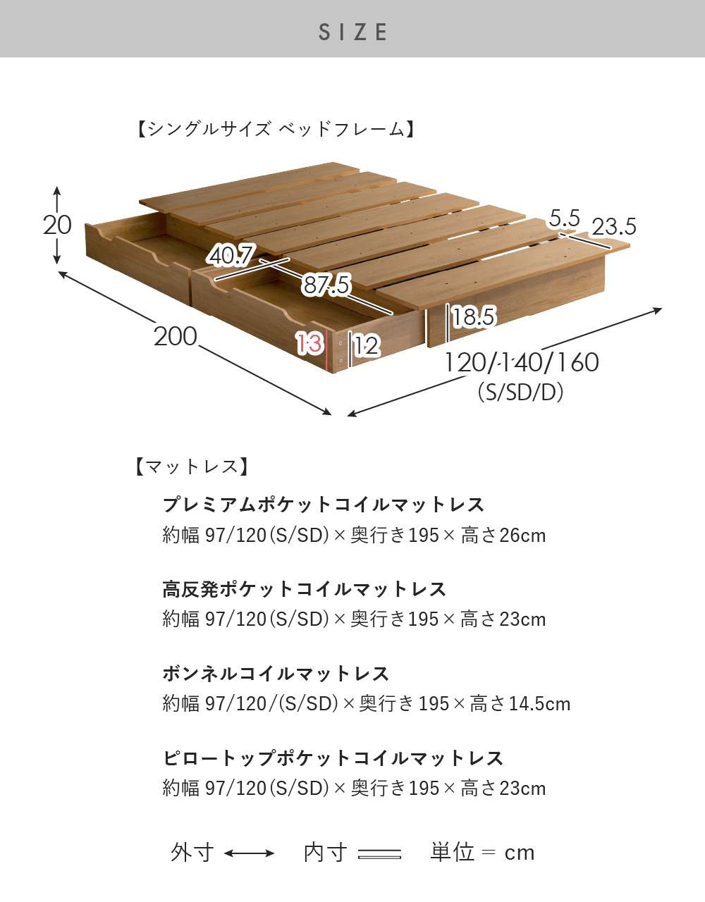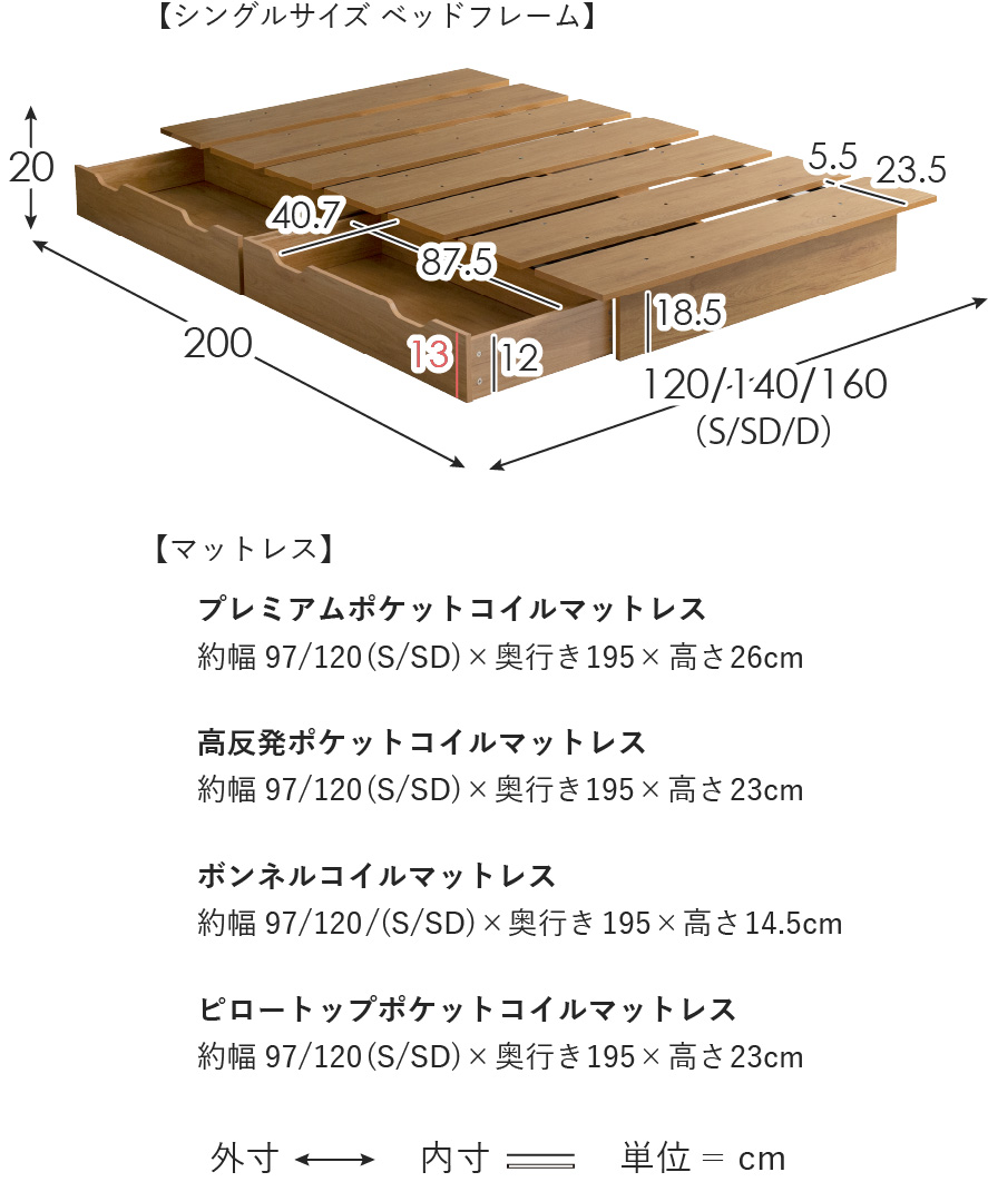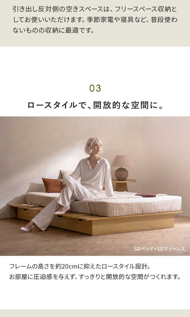 | 耐荷重(ベッドフレーム) | 底板/120kg、引き出し/各5kg |