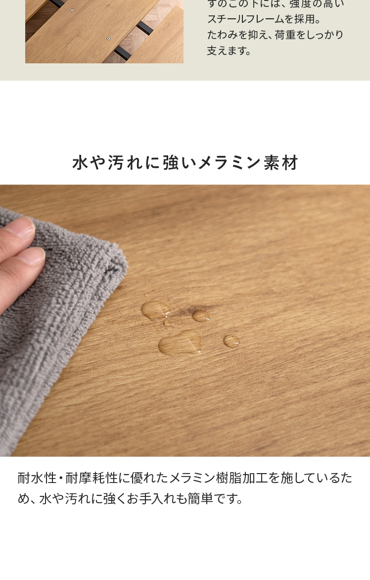 | 材質(ベッドフレーム) | 合成樹脂化粧板(メラミン)、スチール(粉体塗装仕上げ) |