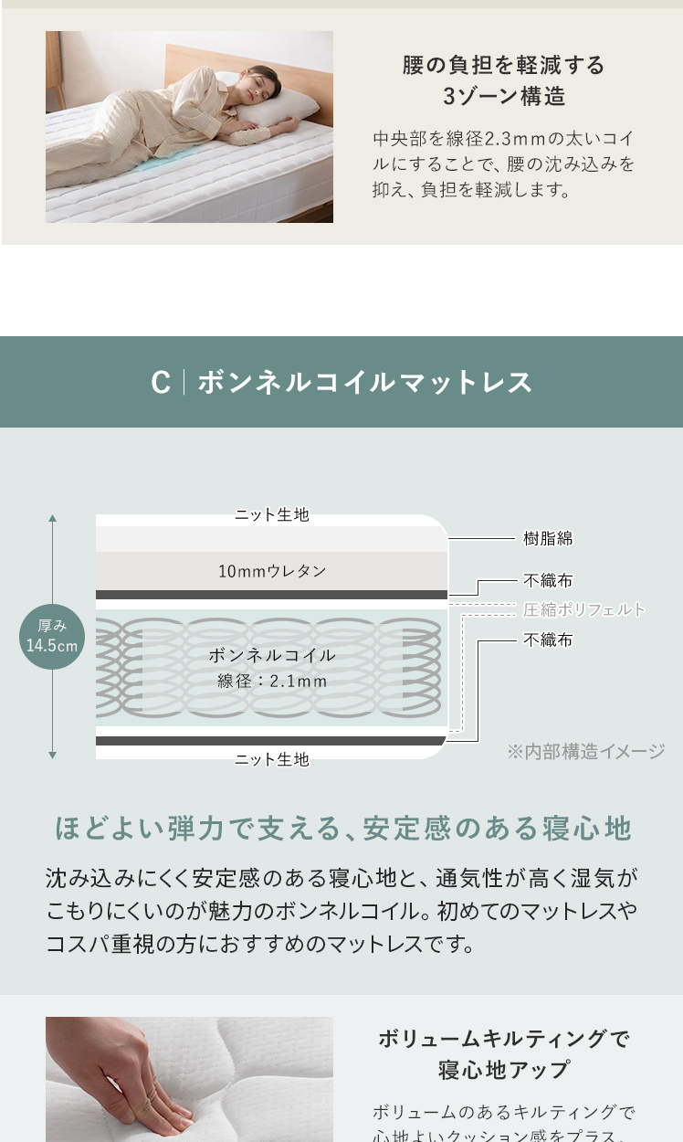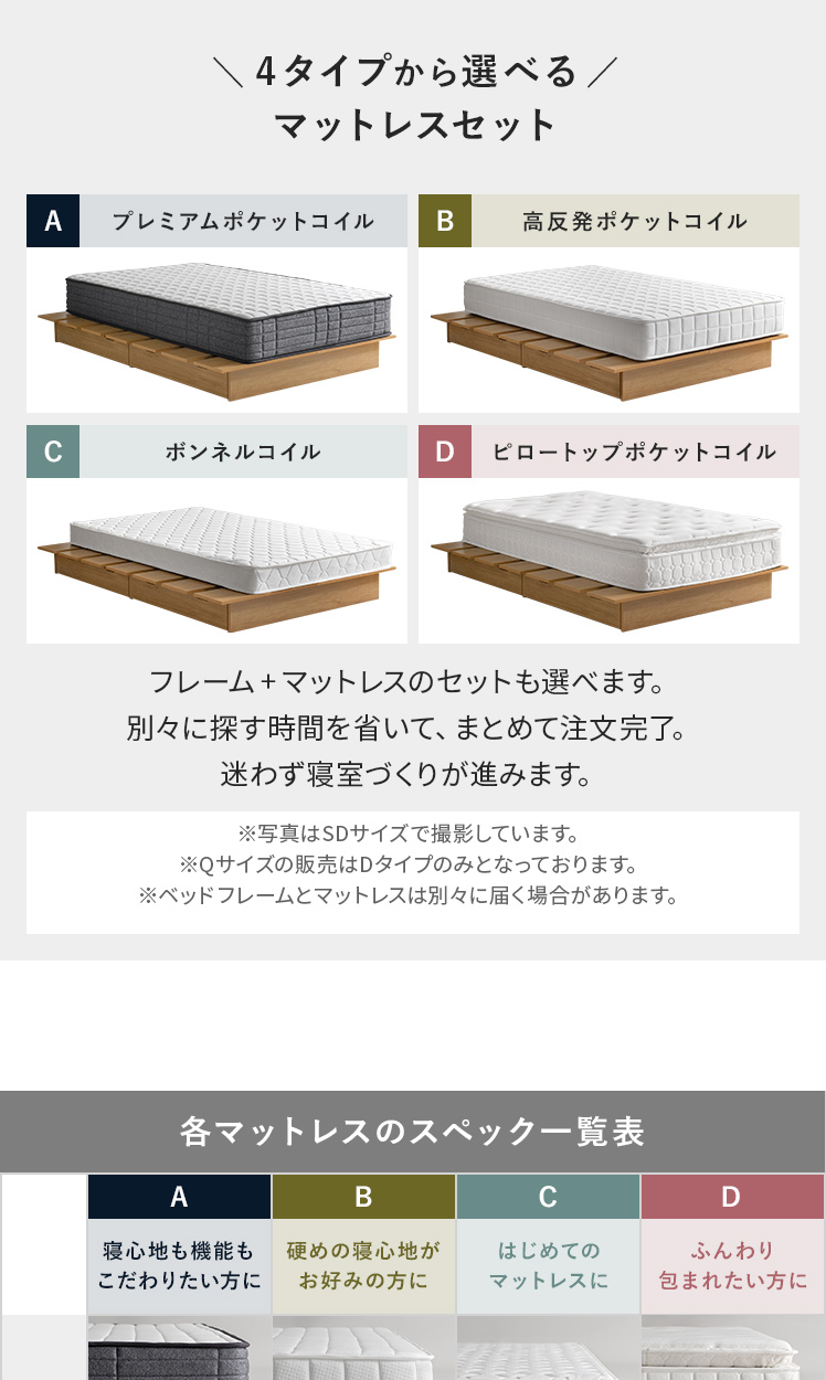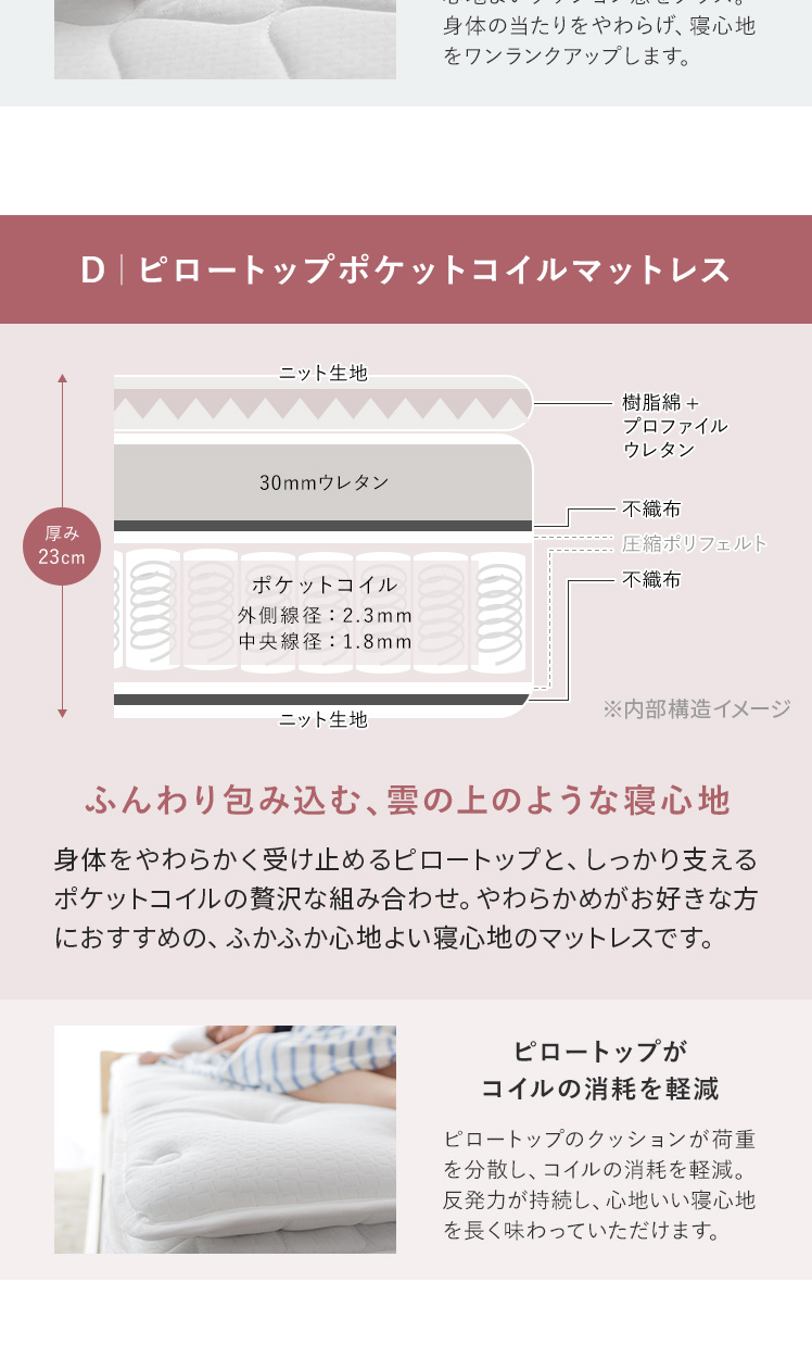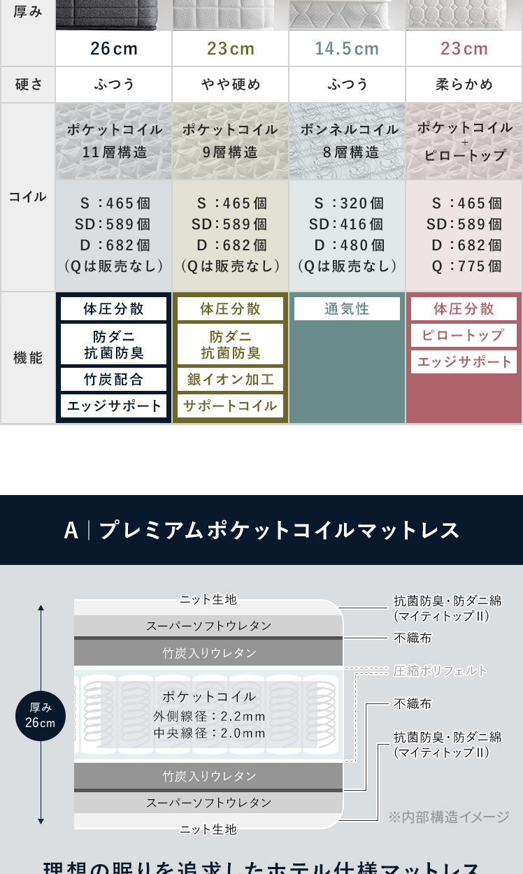 | サイズ(マットレス) | 【A:プレミアムポケットコイルマットレス】 シングル/約幅97×奥行き195×高さ26cm セミダブル/約幅120×奥行き195×高さ26cm 【B:高反発ポケットコイルマットレス】 シングル/約幅97×奥行き195×高さ23cm セミダブル/約幅120×奥行き195×高さ23cm 【C:ボンネルコイルマットレス】 シングル/約幅97×奥行き195×高さ14.5cm セミダブル/約幅120×奥行き195×高さ14.5cm 【D:ピロートップポケットコイルマットレス】 シングル/約幅97×奥行き195×高さ23cm セミダブル/約幅120×奥行き195×高さ23cm |