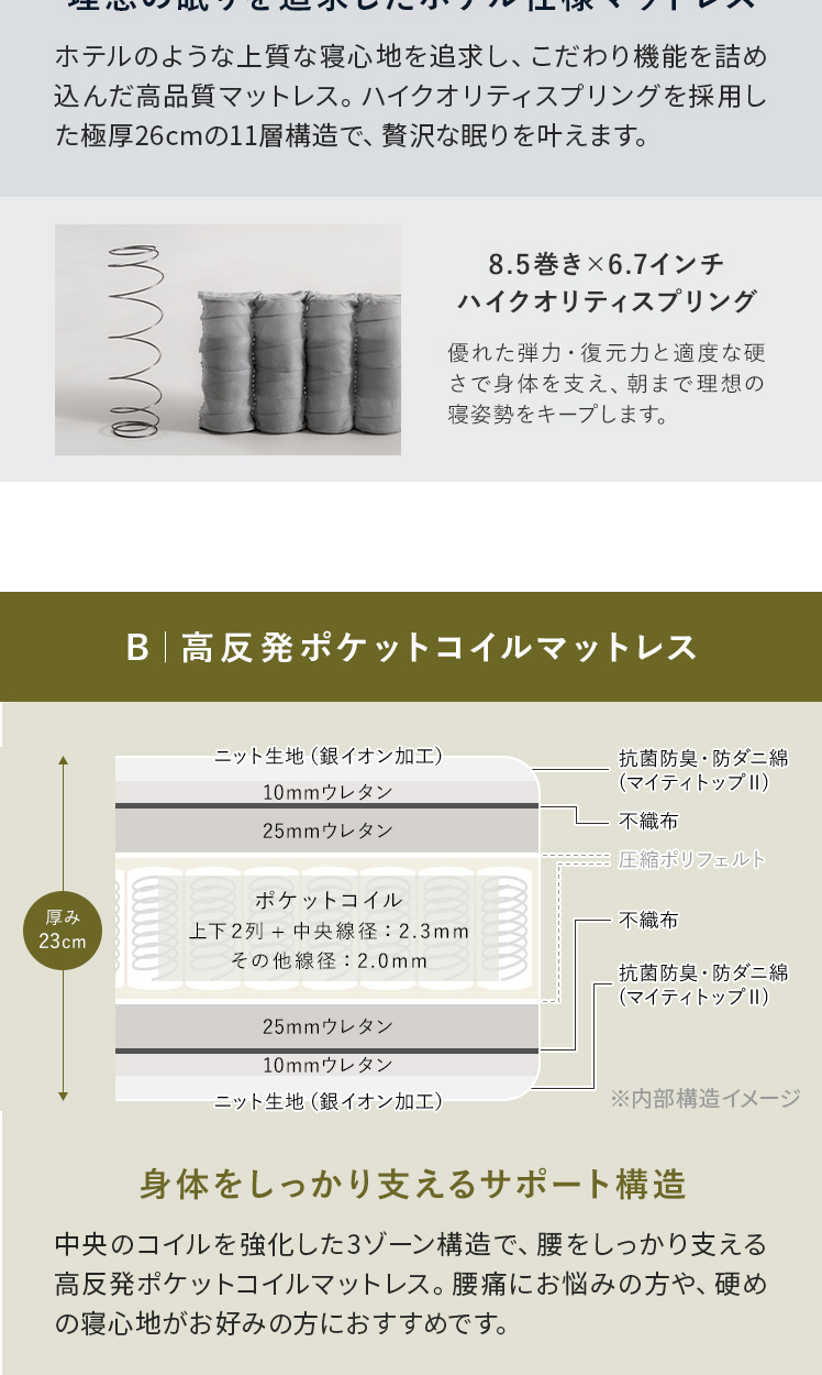 | 材質(マットレス) | 【A】ニット生地、ポケットコイル、竹炭入りウレタン、SUPER SOFTウレタン、MIGHTY TOP抗菌防臭防ダニ混合綿、不織布 【B】ニット生地(銀イオン加工)、ポケットコイル、ウレタン、MIGHTY TOP抗菌防臭防ダニ混合綿、不織布、メッシュ生地 【C】ニット生地、樹脂綿、ウレタン、圧縮ポリフェルト、ボンネルコイル、不織布 【D】 フェルト、ウレタン、不織布、ポリエステル100% |