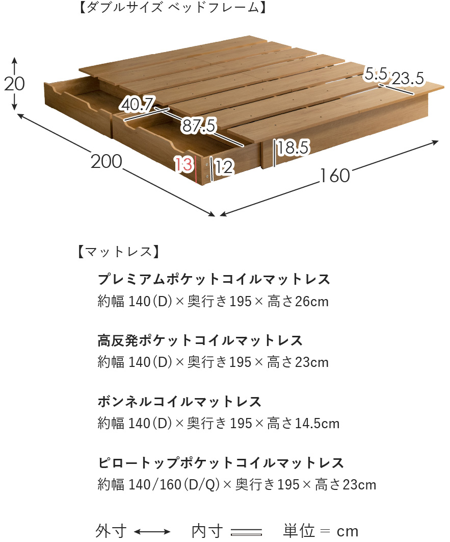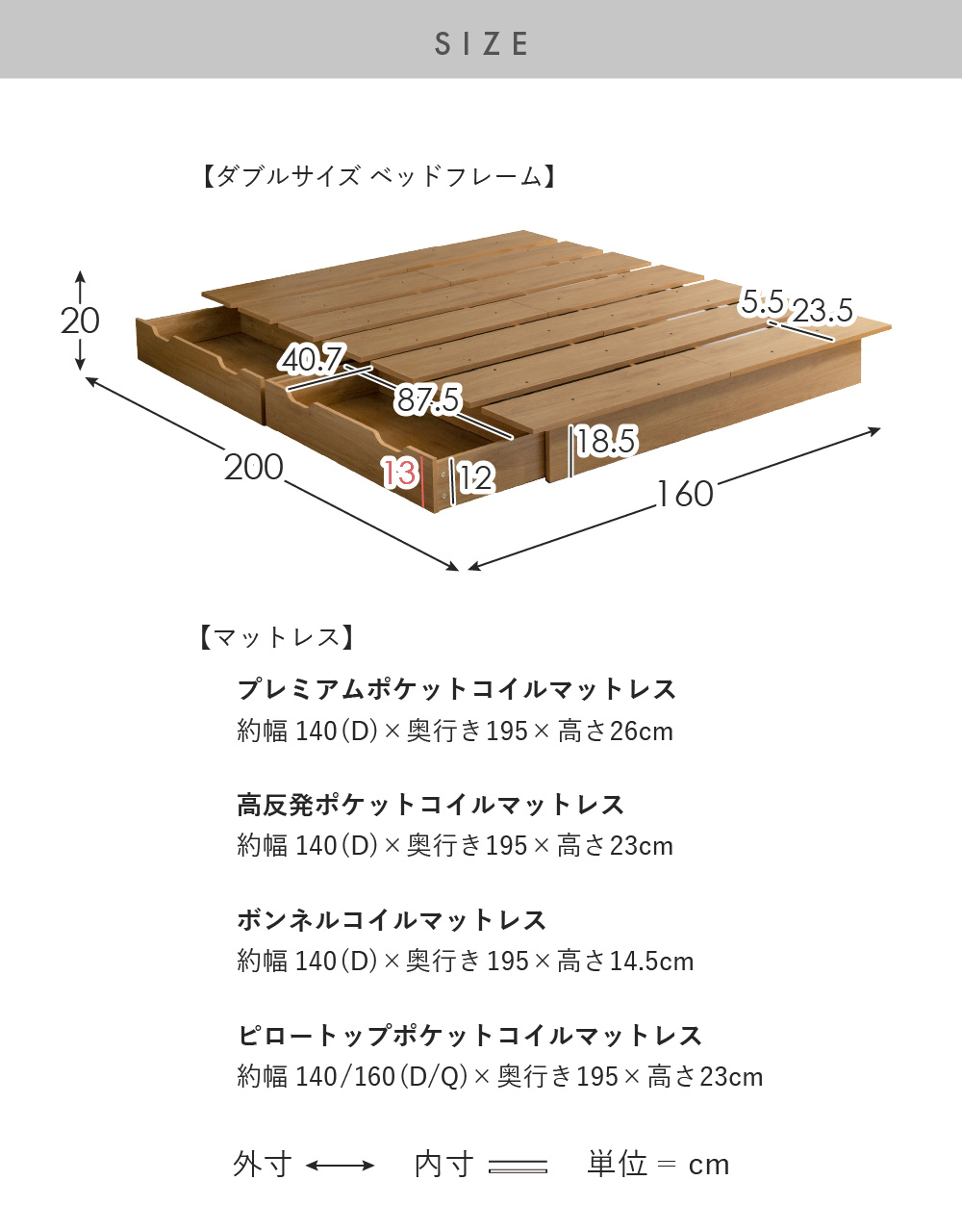 | サイズ(ベッドフレーム) | 約幅200×奥行き160×高さ20cm |