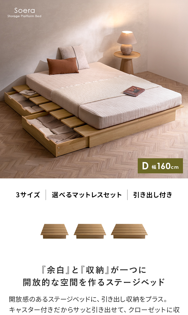 収納付きステージベッド Soera〔ソエラ〕 ダブルサイズ/開放感のあるステージベッドに、引き出し収納をプラス。キャスター付きだからサッと引き出せて、クローゼットに収まりきらない衣類や雑貨をすっきり収納できます。