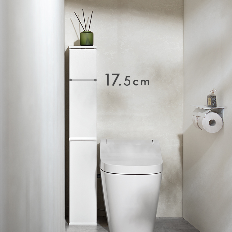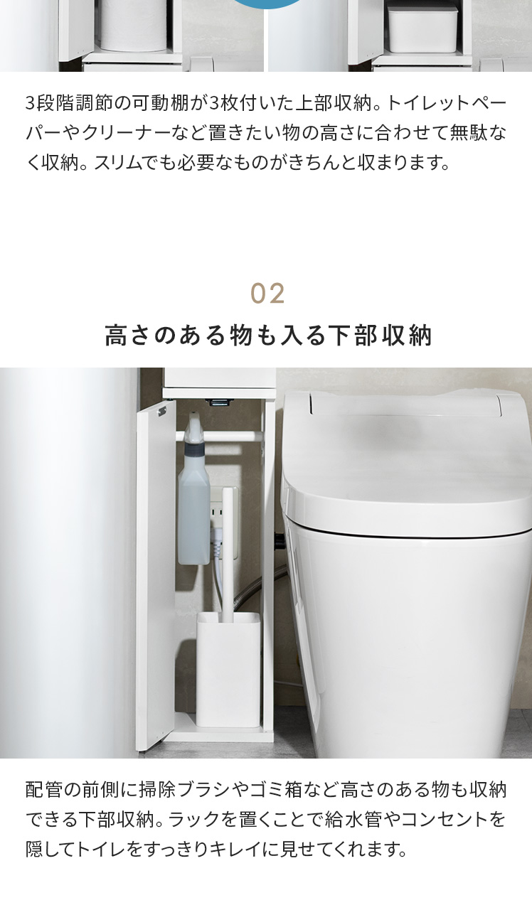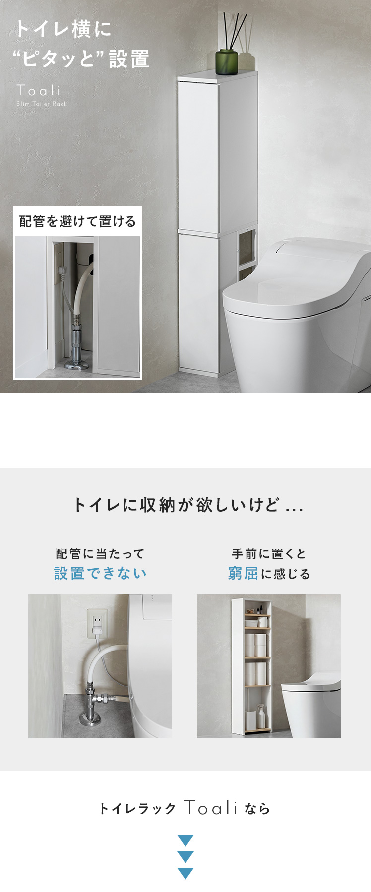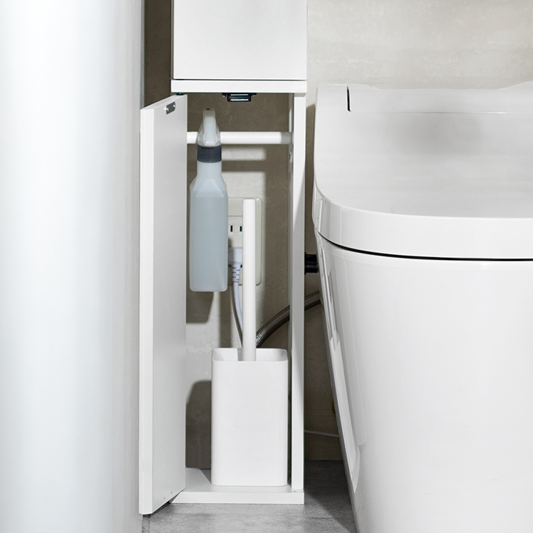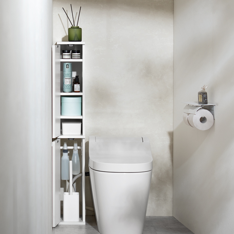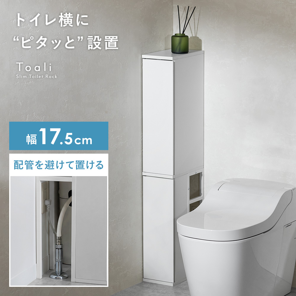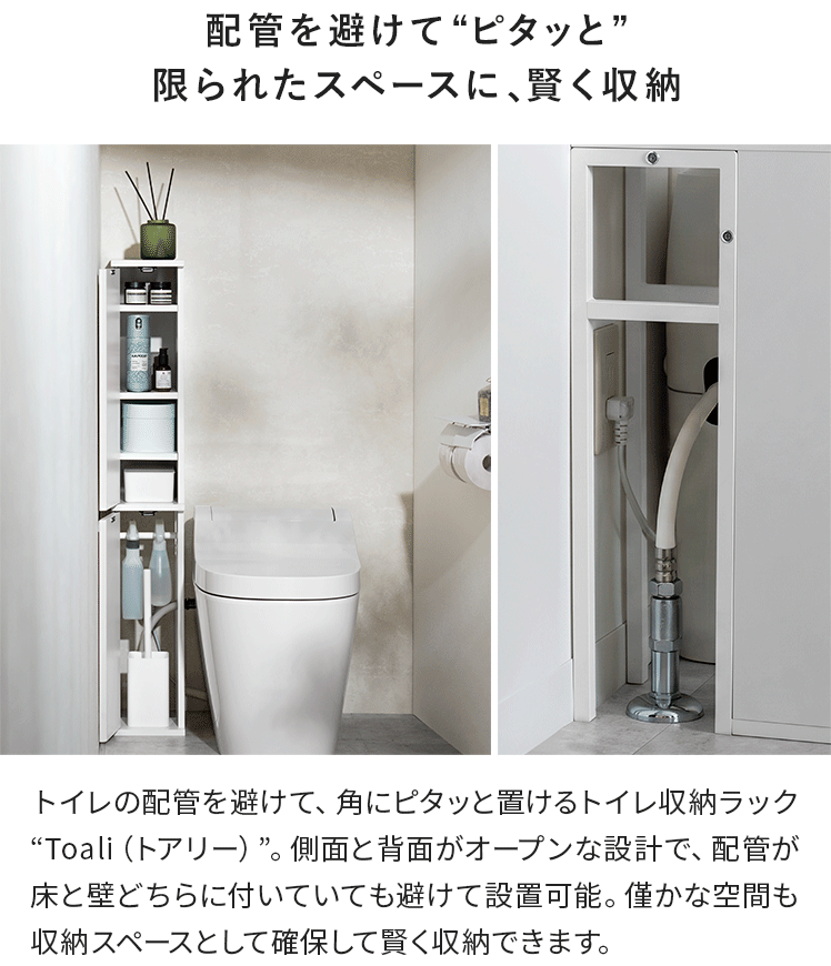 トイレ収納ラック Toali〔トアリー〕/トイレの配管を避けて、角にピタッと置けるトイレ収納ラック“Toali(トアリー)”。側面と背面がオープンな設計で、配管が床と壁どちらに付いていても避けて設置可能。僅かな空間も収納スペースとして確保して賢く収納できます。