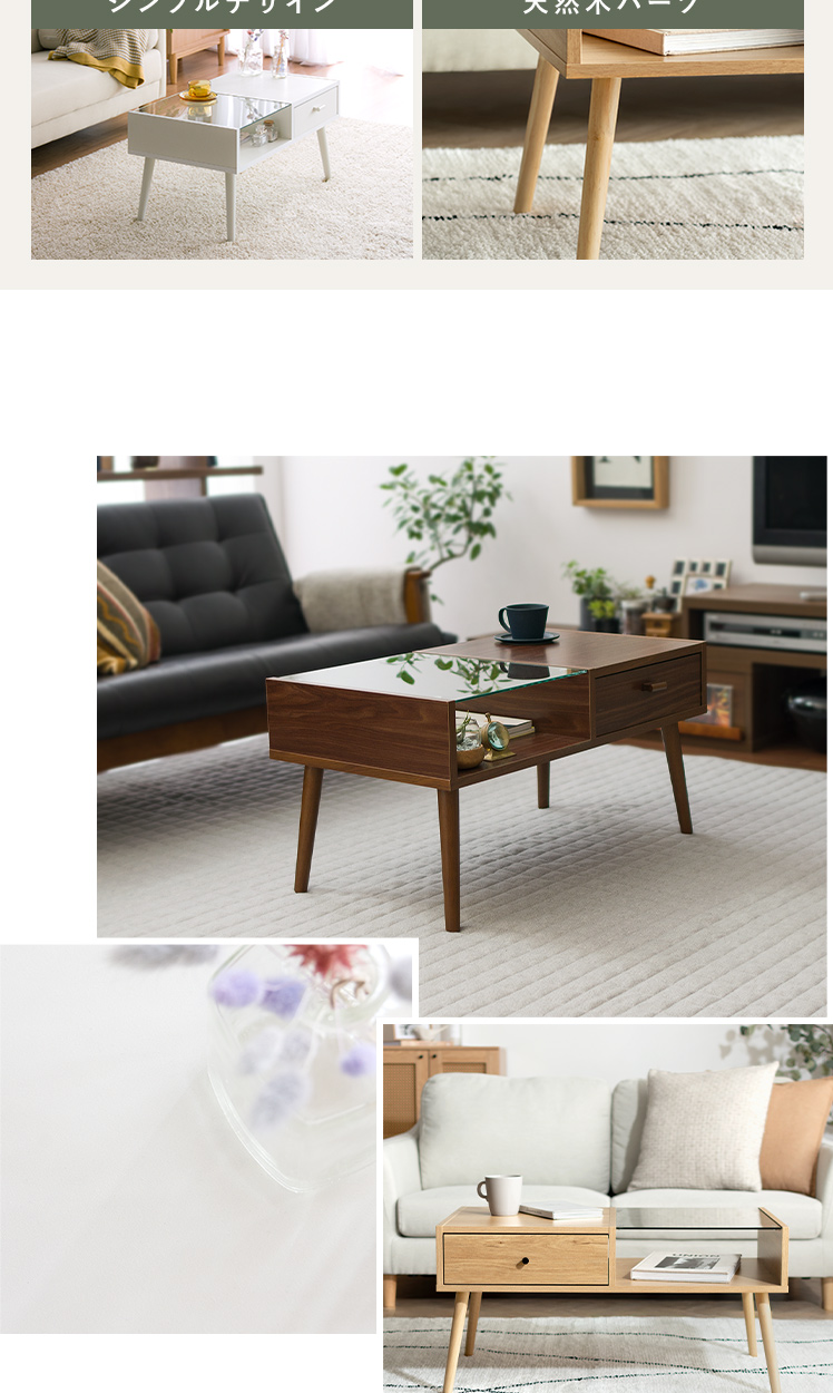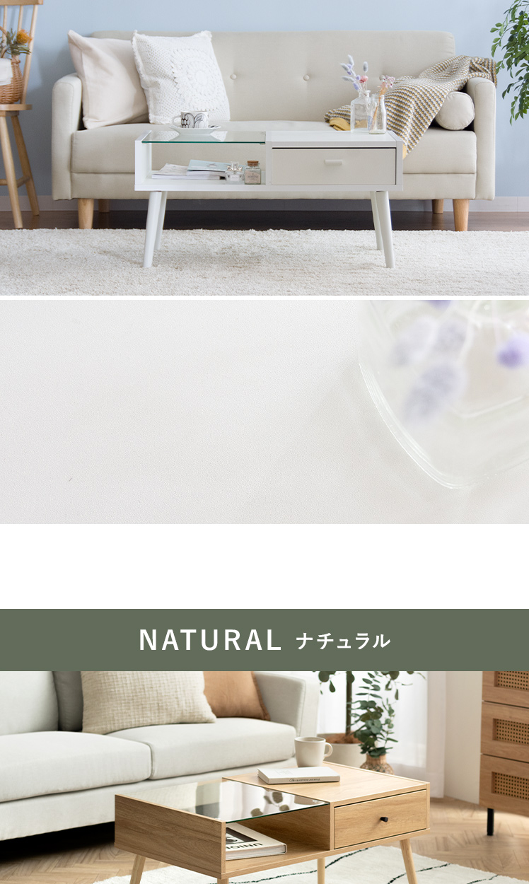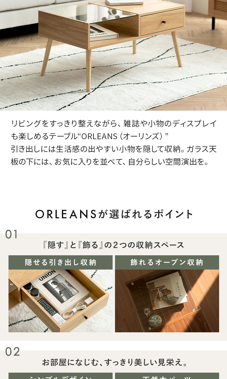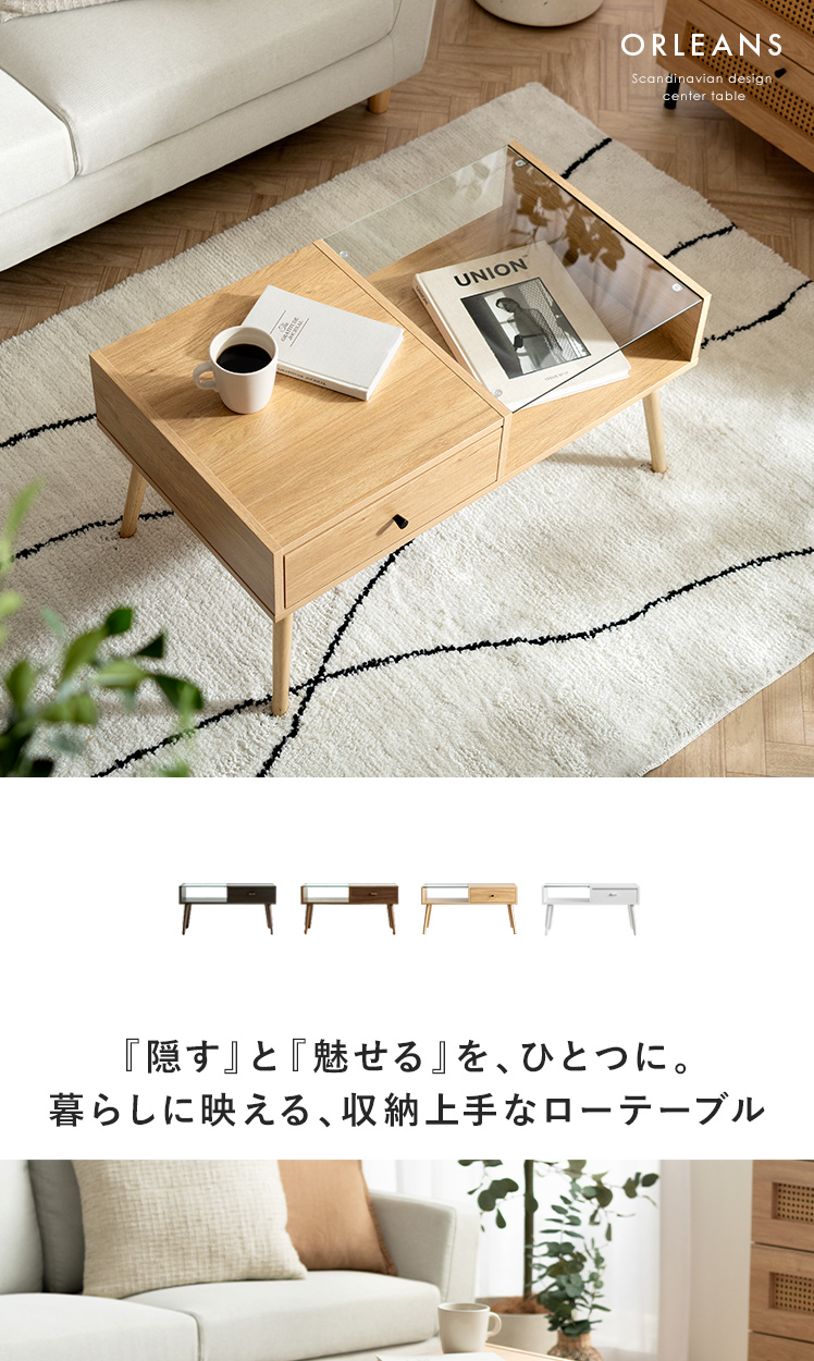センターテーブルORLEANS/リビングをすっきり整えながら、雑誌や小物のディスプレイも楽しめるテーブル“ORLEANS(オーリンズ)”引き出しには生活感の出やすい小物を隠して収納。ガラス天板の下には、お気に入りを並べて、自分らしい空間演出を。
