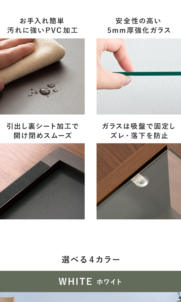 | 耐荷重 | 天板/5kg、ガラス板/3kg、引き出し/2kg、ガラス下収納部/3kg |