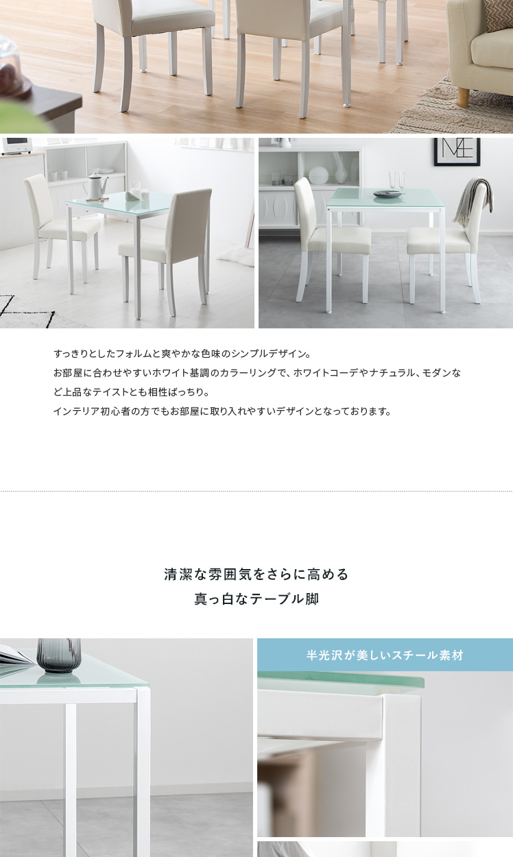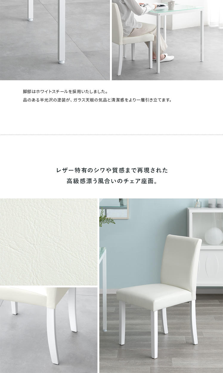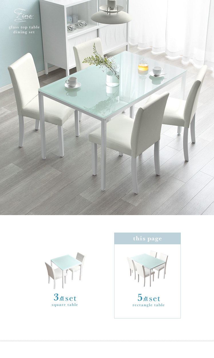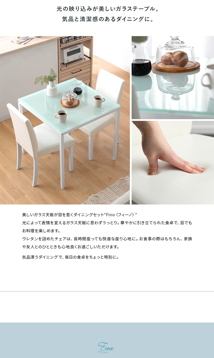ガラストップダイニング5点セット〔木脚チェアタイプ〕/美しいガラス天板が目を惹くダイニングセット“Fino(フィーノ)”光によって表情を変えるガラス天板に思わずうっとり。華やかに引き立てられた食卓で、目でもお料理を楽しめます。ウレタンを詰めたチェアは、長時間座っても快適な座り心地に。お食事の際はもちろん、家族や友人とのひとときも心地良くお過ごしいただけます。気品漂うダイニングで、毎日の食卓をちょっと特別に。