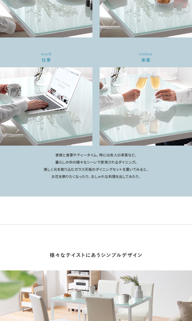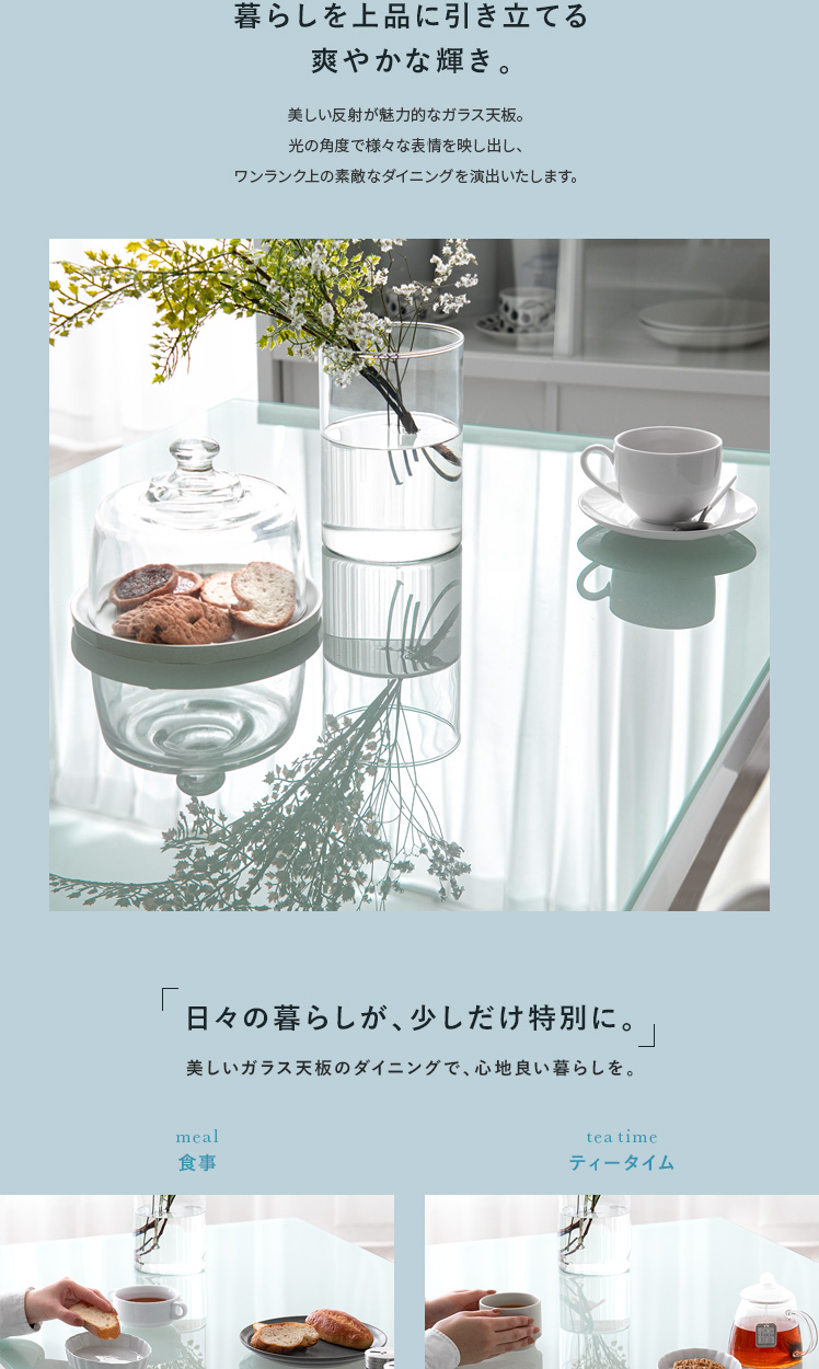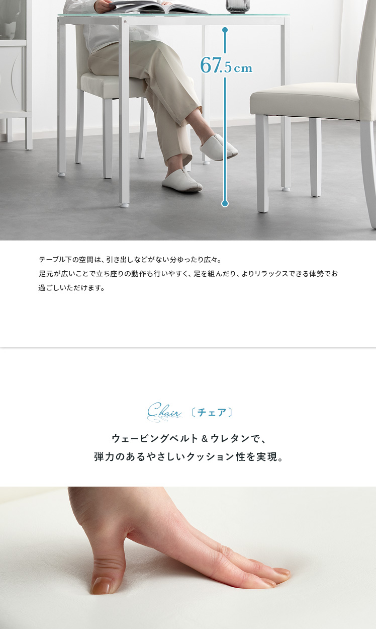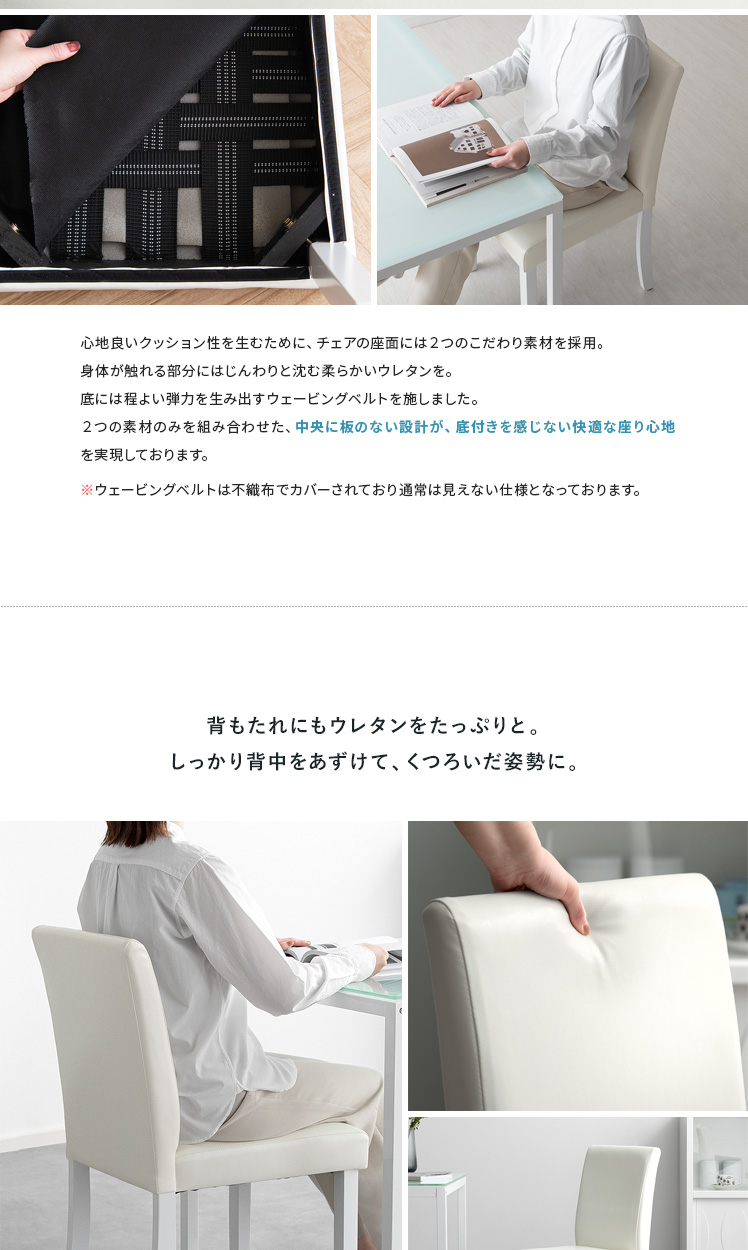 ガラストップダイニング5点セット〔木脚チェアタイプ〕/美しいガラス天板が目を惹くダイニングセット“Fino(フィーノ)”光によって表情を変えるガラス天板に思わずうっとり。華やかに引き立てられた食卓で、目でもお料理を楽しめます。ウレタンを詰めたチェアは、長時間座っても快適な座り心地に。お食事の際はもちろん、家族や友人とのひとときも心地良くお過ごしいただけます。気品漂うダイニングで、毎日の食卓をちょっと特別に。