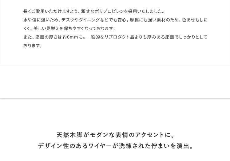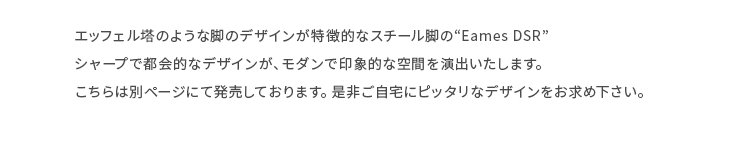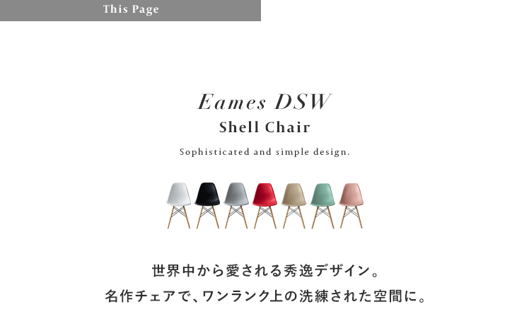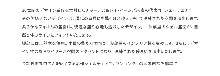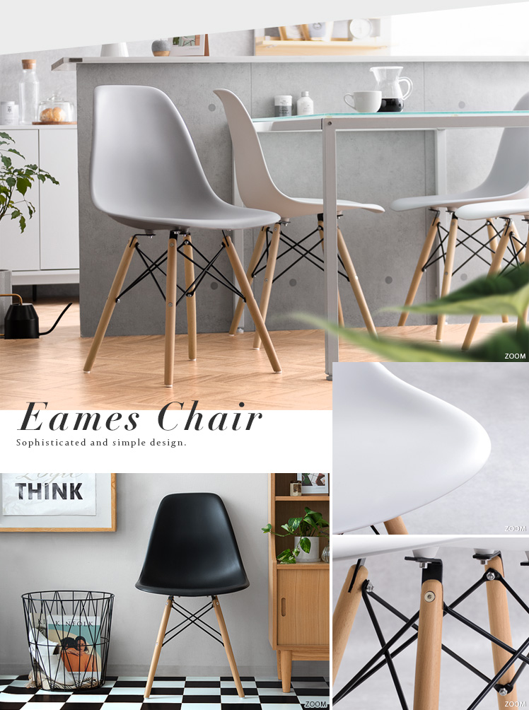 イームズ シェルチェア DSW/20世紀のデザイン業界を牽引したチャールズ&レイ・イームズ夫妻の代表作“シェルチェア”その色褪せないデザインは、現代の家具にも驚くほど映え、そして洗練された空間を演出します。柔らかなフォルムの座面は、快適な座り心地も追及したデザイン。一体成型のシェル座面が、自然と体のラインにフィットいたします。脚部には天然木を使用。木目の豊かな表情が、お部屋のインテリア性を高めます。さらに、デザイン性のあるワイヤーが空間のアクセントになり、洗練された佇まいを演出いたします。今なお世界中の人を魅了する名作シェルチェアで、ワンランク上の印象的なお部屋に。