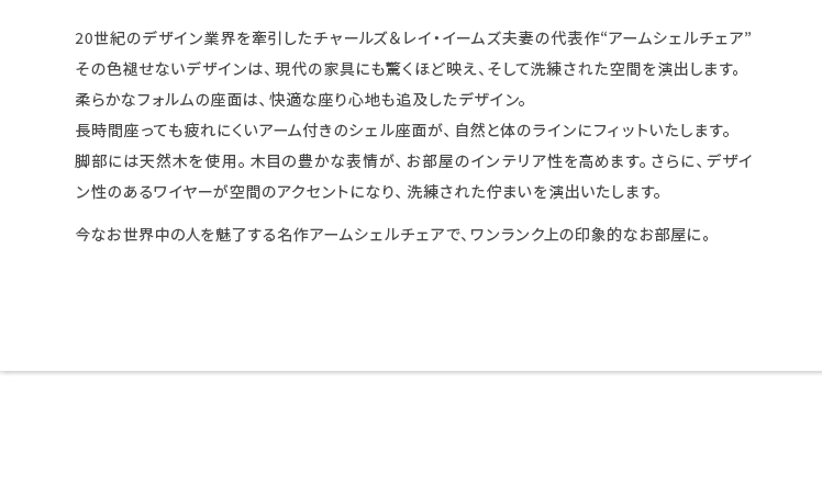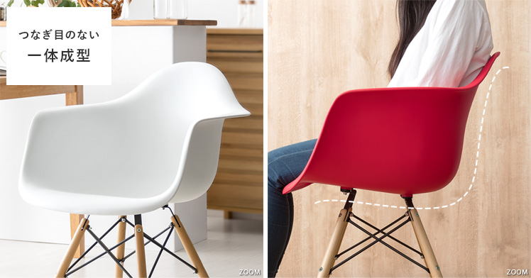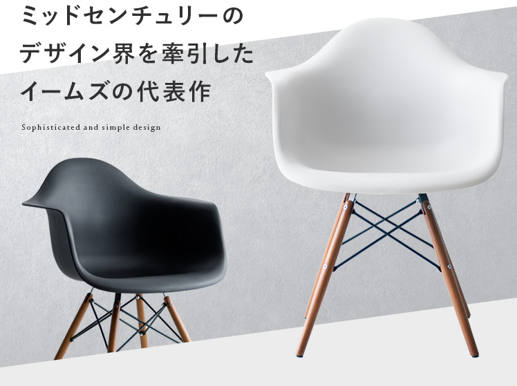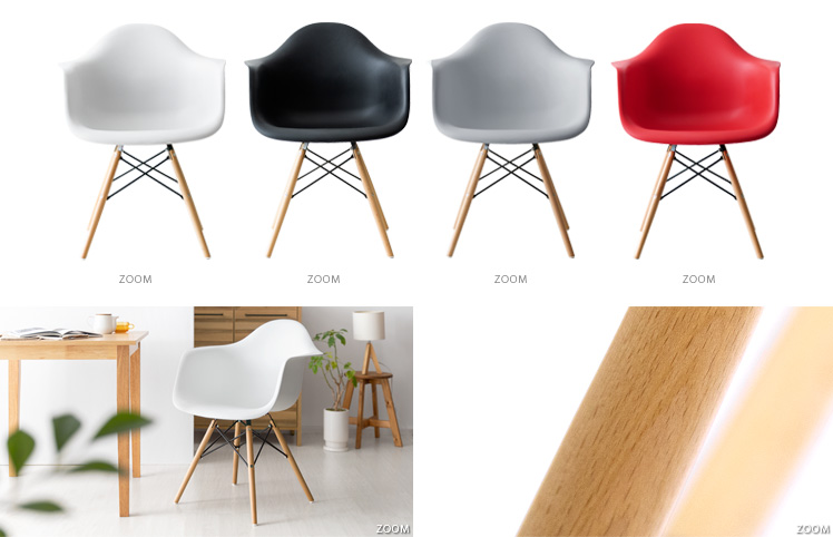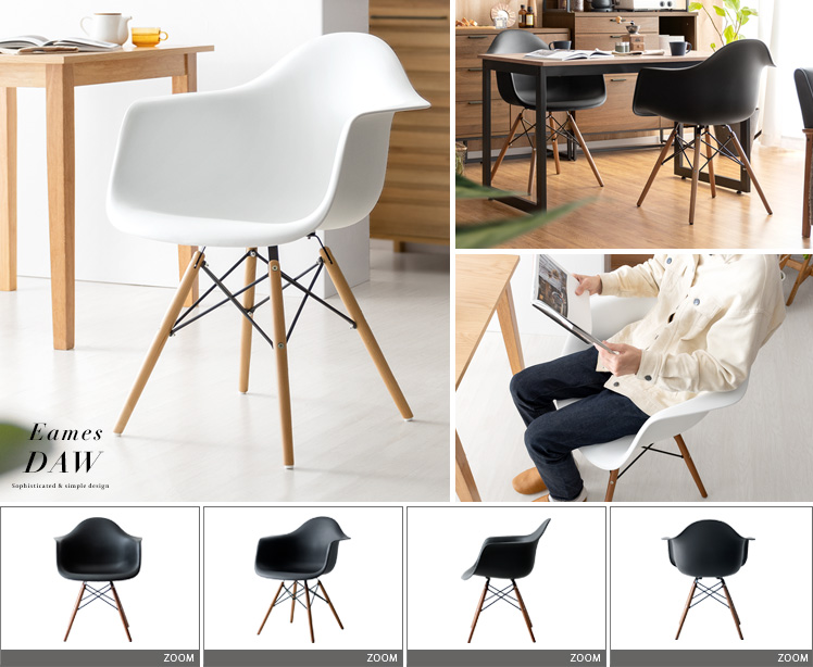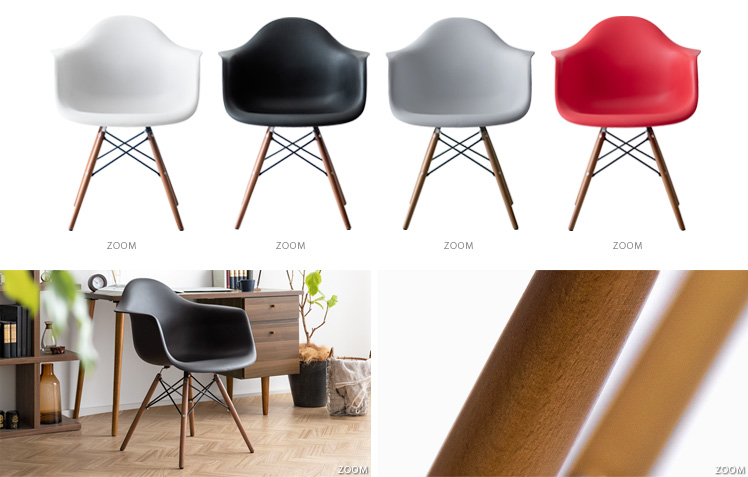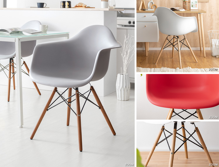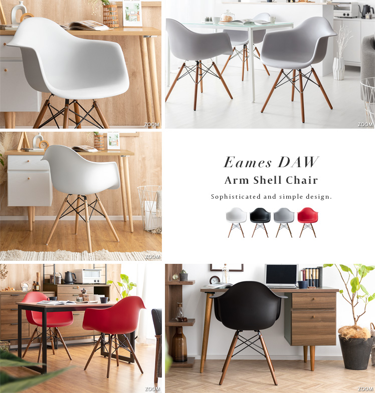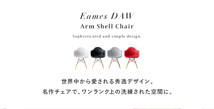 イームズチェア DAW/20世紀のデザイン業界を牽引したチャールズ&レイ・イームズ夫妻の代表作“アームシェルチェア”その色褪せないデザインは、現代の家具にも驚くほど映え、そして洗練された空間を演出します。柔らかなフォルムの座面は、快適な座り心地も追及したデザイン。長時間座っても疲れにくいアーム付きのシェル座面が、自然と体のラインにフィットいたします。脚部には天然木を使用。木目の豊かな表情が、お部屋のインテリア性を高めます。さらに、デザイン性のあるワイヤーが空間のアクセントになり、洗練された佇まいを演出いたします。今なお世界中の人を魅了する名作アームシェルチェアで、ワンランク上の印象的なお部屋に。