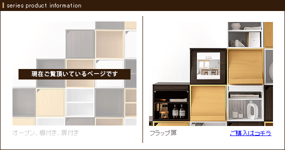 オープン、棚付き、扉付き、フラップ扉の4タイプ展開。天板と底板のサイズを統一し、どのタイプ同士でも上下に連結可能となっております。