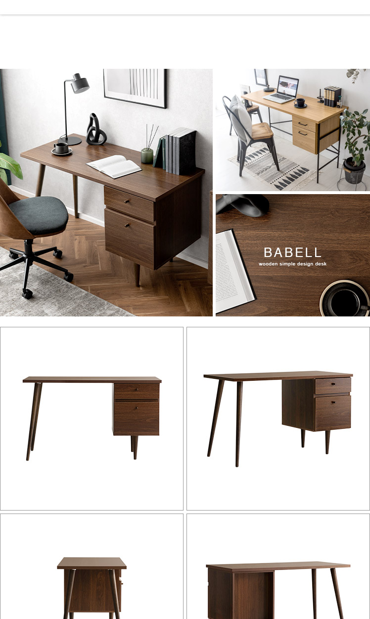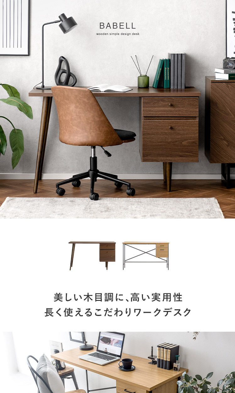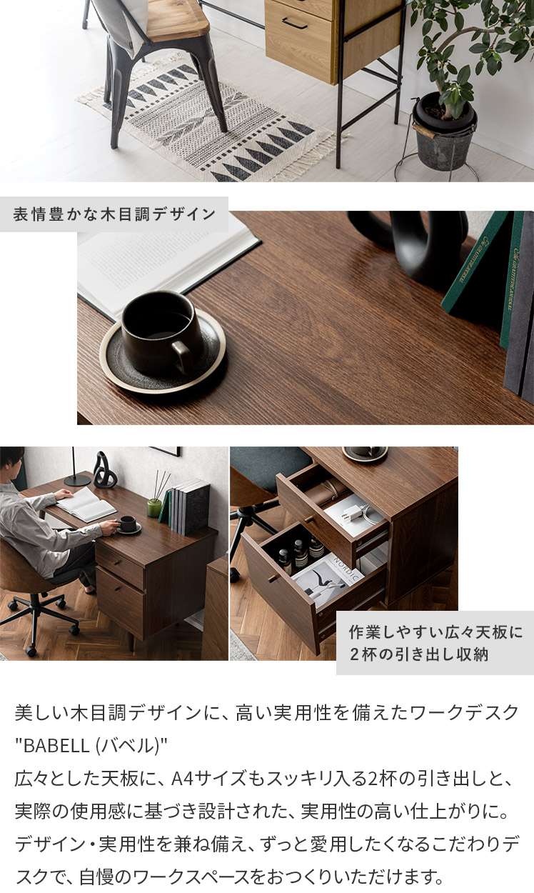 パソコンデスク BABELL〔バベル〕/美しい木目調デザインに、高い実用性を備えたワークデスク"BABELL (バベル)"広々とした天板に、A4サイズもスッキリ入る2杯の引き出しと、実際の使用感に基づき設計された、実用性の高い仕上がりに。デザイン・実用性を兼ね備え、ずっと愛用したくなるこだわりデスクで、自慢のワークスペースをおつくりいただけます。