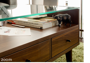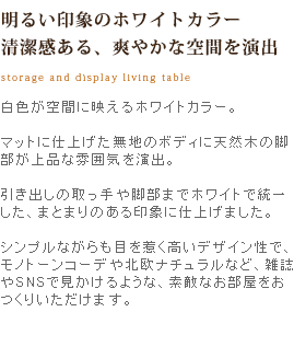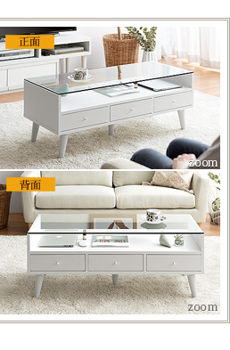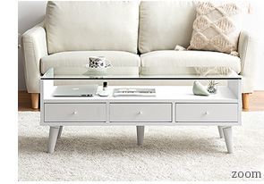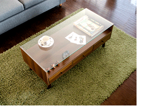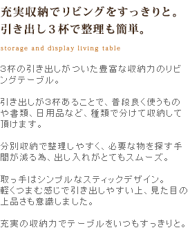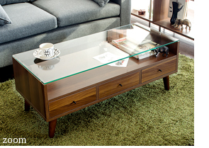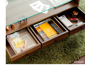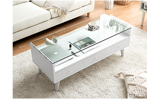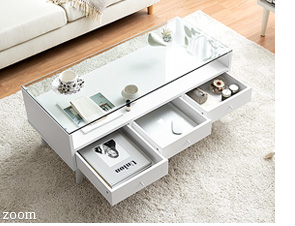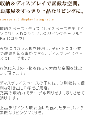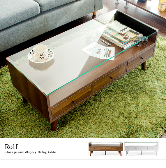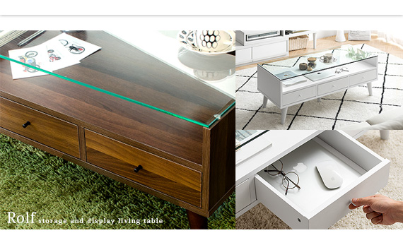 センターテーブル Rolf(ロルフ) / 収納スペースとディスプレイスペースをデザインに取り入れたシンプルなリビングテーブル"Rolf(ロルフ)"天板にはガラス板を使用し、その下には小物や雑誌を飾る事ができる、ディスプレイスペースに仕上げました。お気に入りの小物を飾って素敵な空間を演出して頂けます。ディスプレイスペースの下には、分別収納に便利な引き出し3杯をご用意。充実の収納力でテーブル周りをすっきりさせて頂けます。上品デザインの収納面にも優れたテーブルで素敵なリビングづくりを。