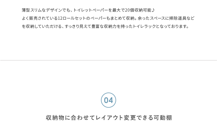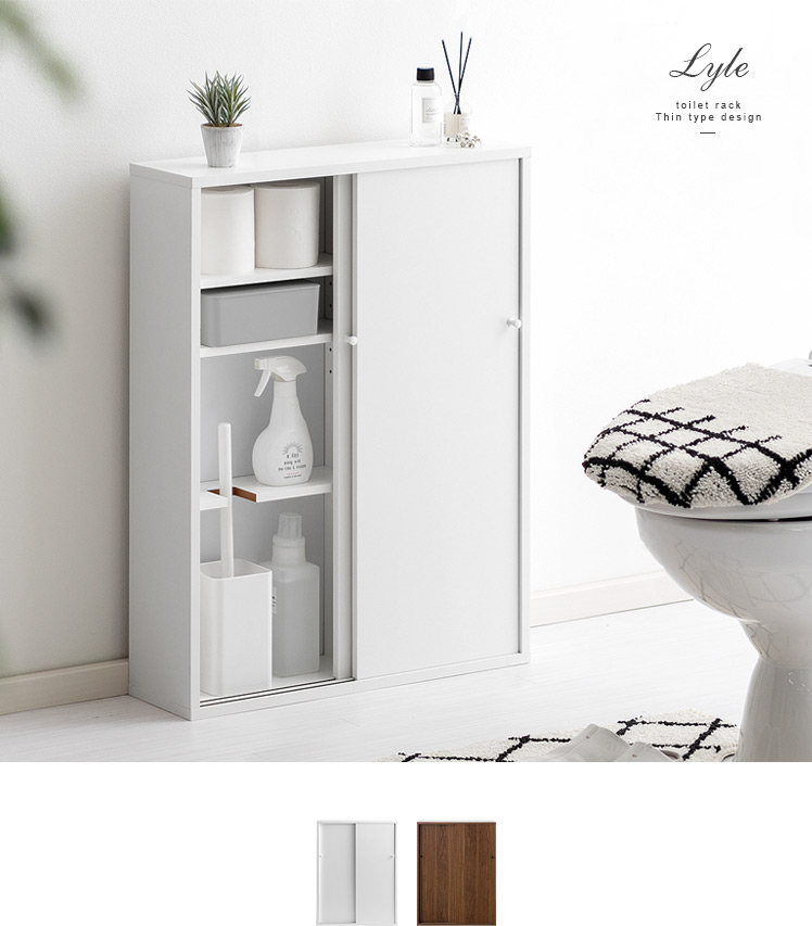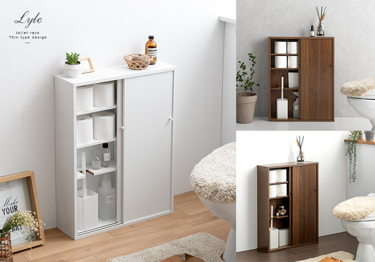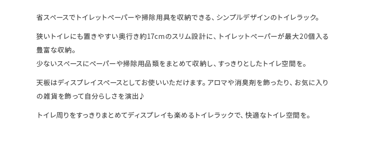 トイレラック Lyle〔ライル〕/省スペースでトイレットペーパーや掃除用具を収納できる、シンプルデザインのトイレラック。狭いトイレにも置きやすい奥行き約17cmのスリム設計に、トイレットペーパーが最大20個入る豊富な収納。少ないスペースにペーパーや掃除用品類をまとめて収納し、すっきりとしたトイレ空間を。天板はディスプレイスペースとしてお使いいただけます。アロマや消臭剤を飾ったり、お気に入りの雑貨を飾って自分らしさを演出♪トイレ周りをすっきりまとめてディスプレイも楽めるトイレラックで、快適なトイレ空間を。
