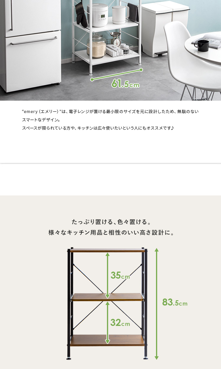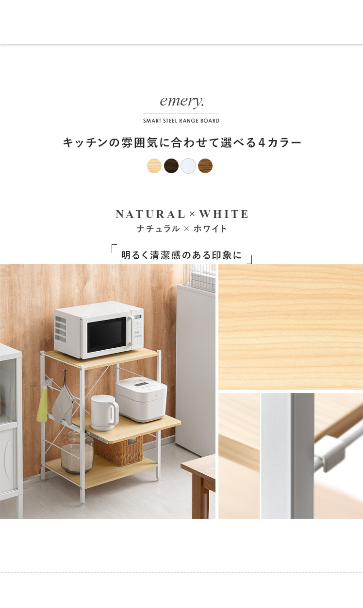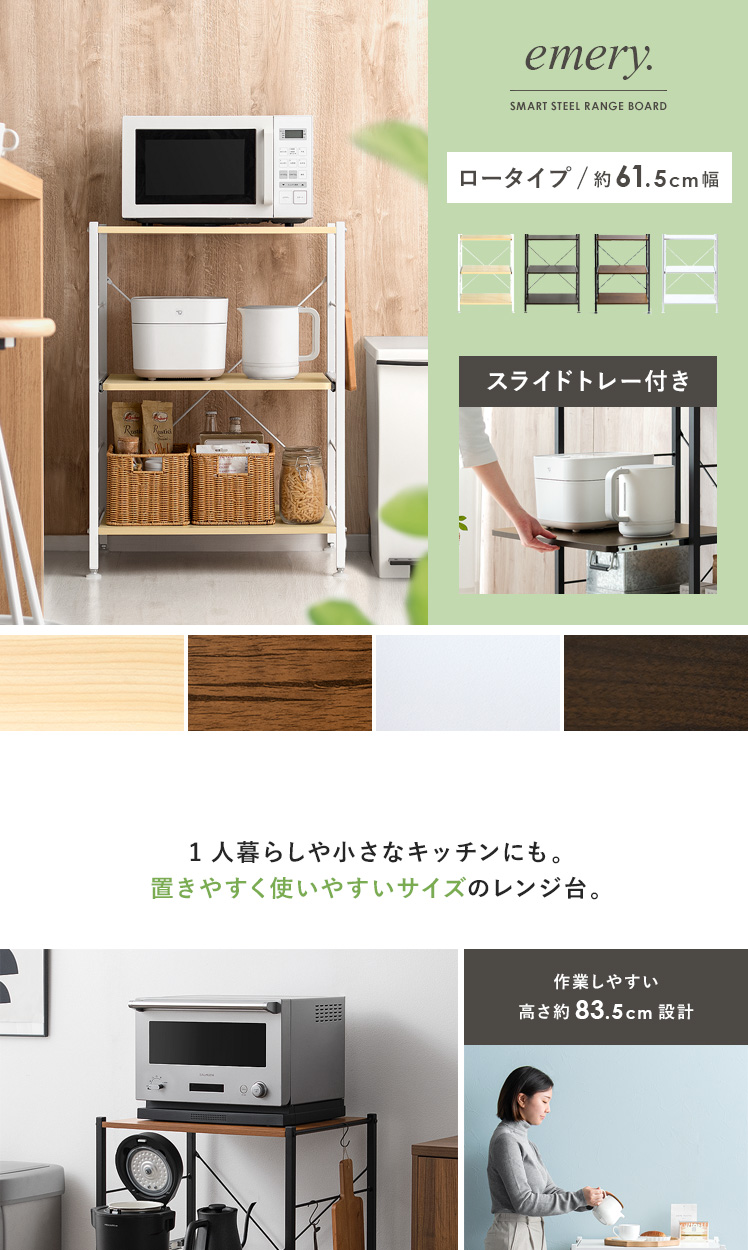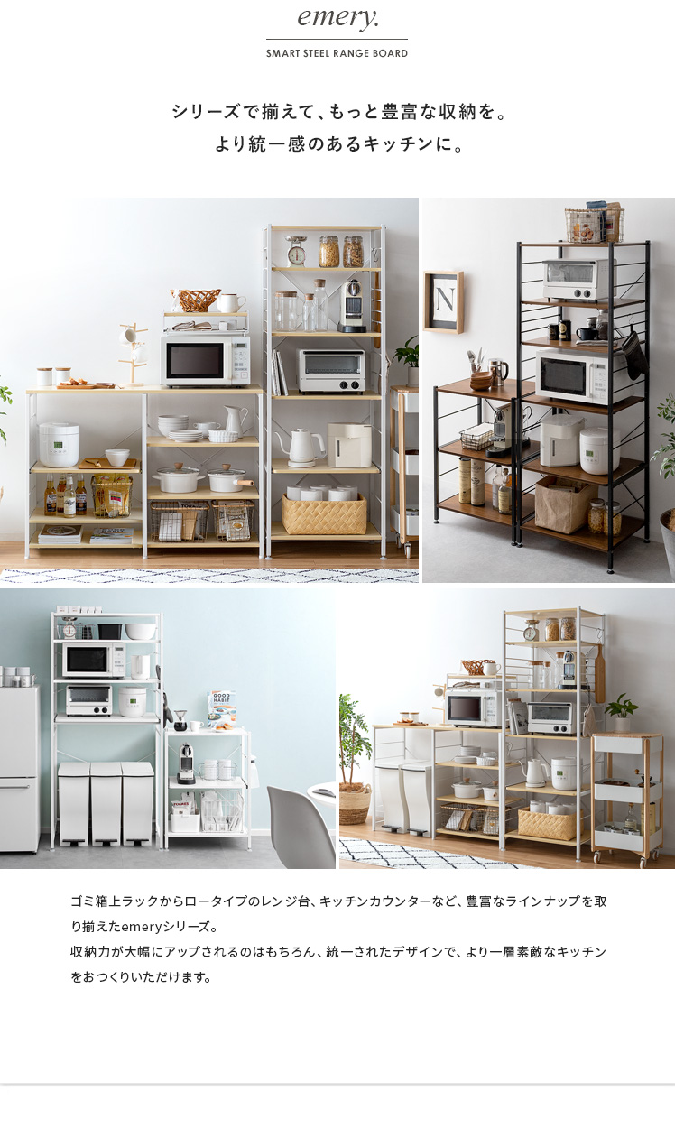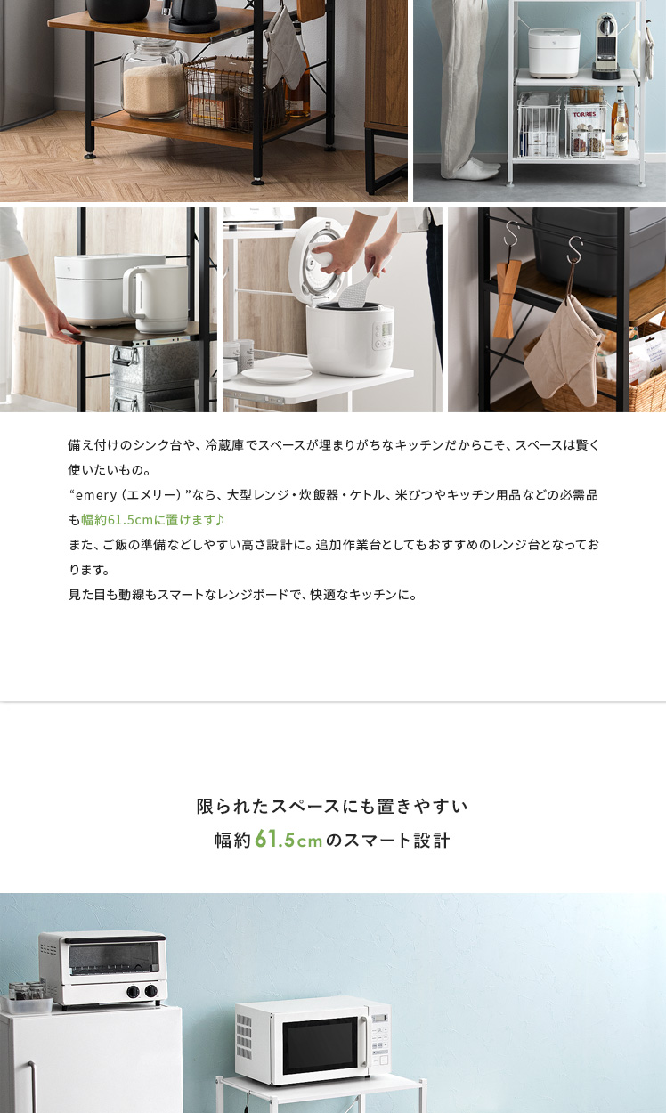 emery〔エメリー〕ロータイプ/備え付けのシンク台や、冷蔵庫でスペースが埋まりがちなキッチンだからこそ、スペースは賢く使いたいもの。 “emery(エメリー)”なら、大型レンジ・炊飯器・ケトル、米びつやキッチン用品などの必需品も幅約61.5cmに置けます♪また、ご飯の準備などしやすい高さ設計に。追加作業台としてもおすすめのレンジ台となっております。見た目も動線もスマートなレンジボードで、快適なキッチンに。