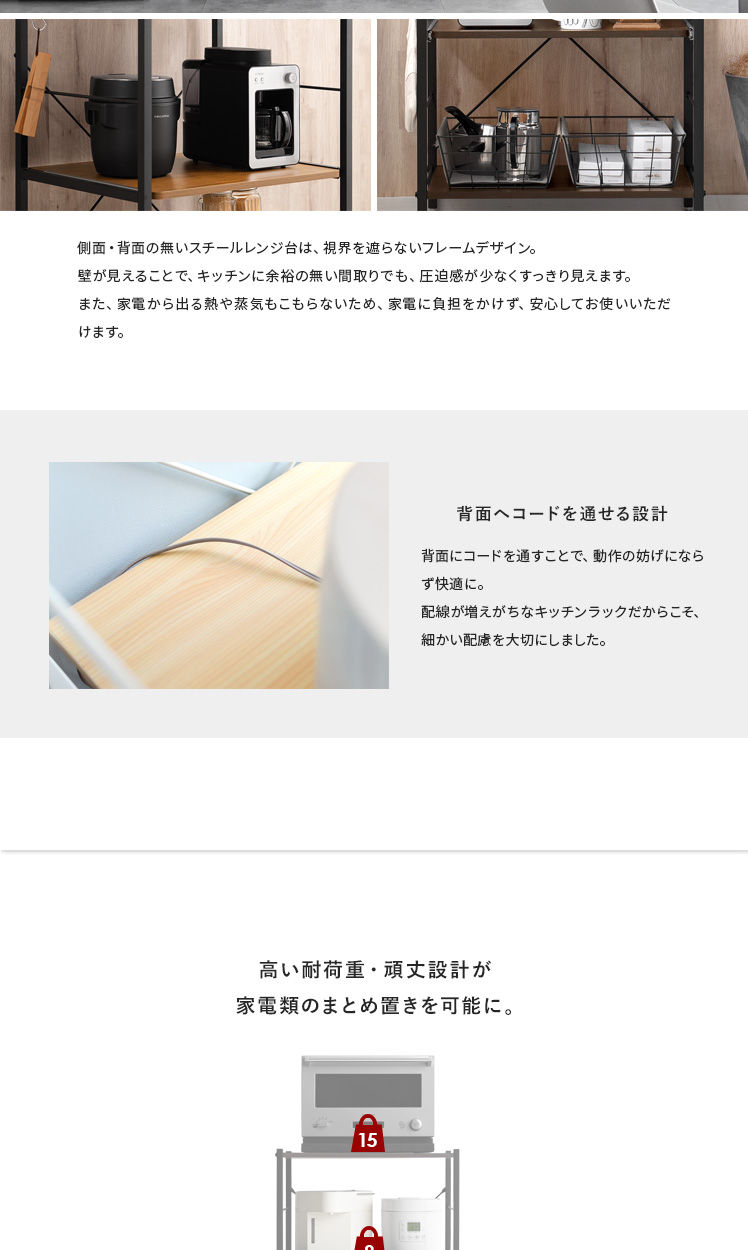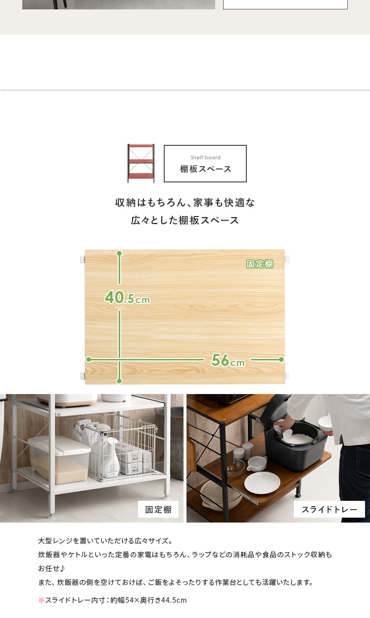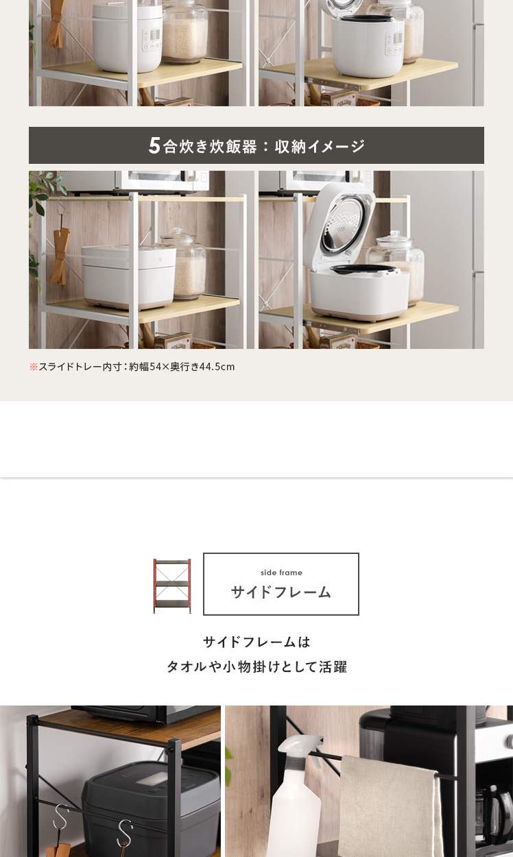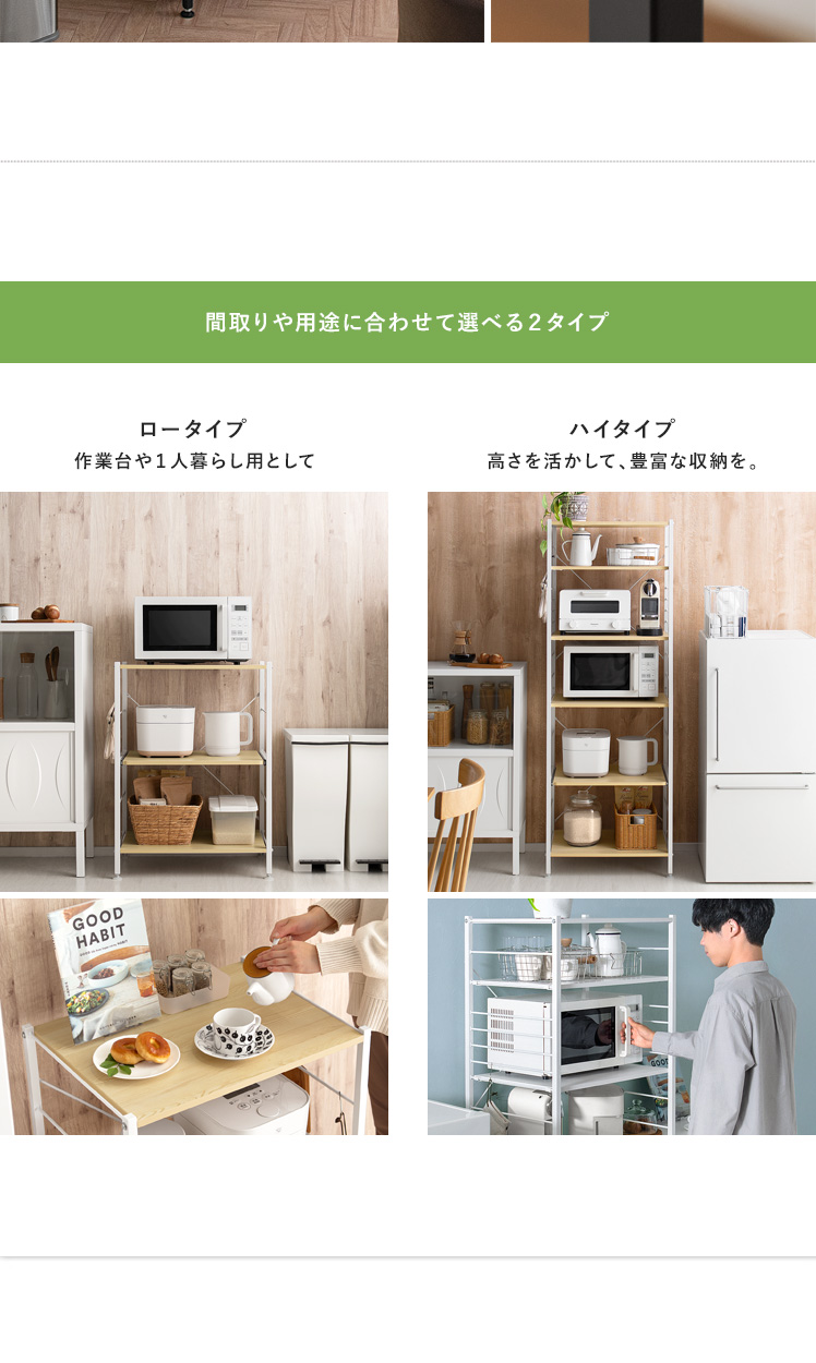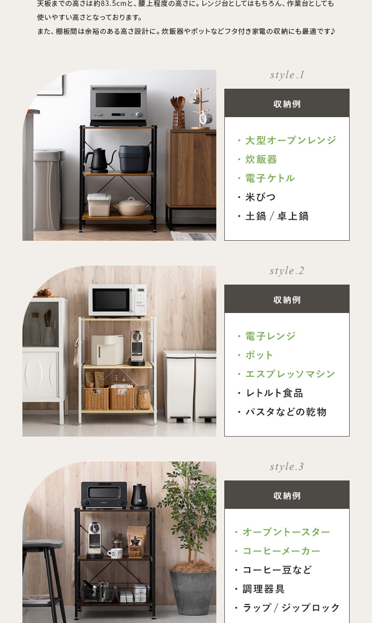 emery〔エメリー〕ロータイプ/備え付けのシンク台や、冷蔵庫でスペースが埋まりがちなキッチンだからこそ、スペースは賢く使いたいもの。 “emery(エメリー)”なら、大型レンジ・炊飯器・ケトル、米びつやキッチン用品などの必需品も幅約61.5cmに置けます♪また、ご飯の準備などしやすい高さ設計に。追加作業台としてもおすすめのレンジ台となっております。見た目も動線もスマートなレンジボードで、快適なキッチンに。