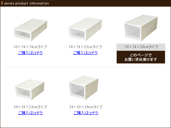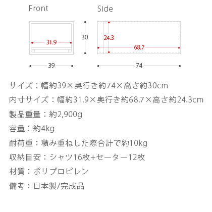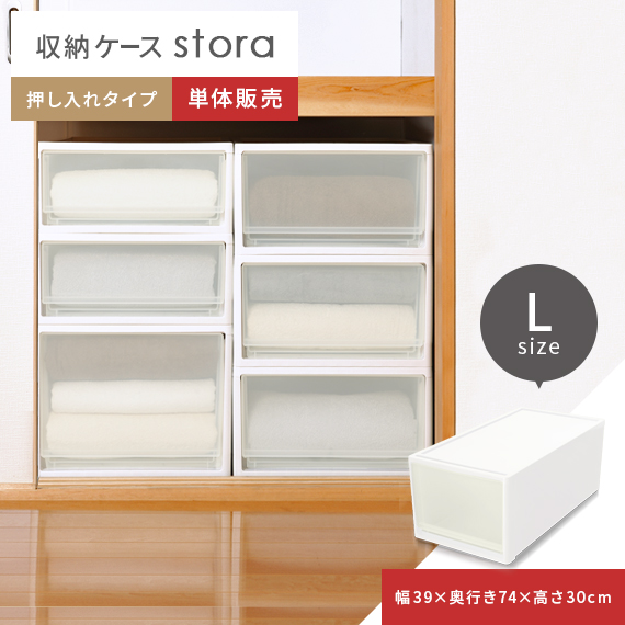 「自分の洋服量に合った収納スペースを作りたい」「押し入れやクローゼットを効率良く使いたい」などのお悩みをお持ちの方にオススメの収納ケース”stora”全5タイプと豊富なサイズ展開ですので、かさの小さい靴下から厚みのあるセーターまで自分の収納したい物にぴったりなサイズをお選び頂けます。またサイズ展開に加え、一つひとつ独立したタイプとなっておりますので、最適なサイズ、最適な数をお選び頂く事で収納スペースを無駄なく使って頂けます。さらに積み重ねるスタッキング式を採用した為、洋服の量が増えてしまった時も簡単に追加が可能。追加の際も同じ収納ケースを使うことで見た目もすっきり綺麗♪押し入れやクローゼットだけでなく普段デッドスペースになりがちなベッド下などにも最適。空間を有効活用して自分にぴったりの収納空間をお作り頂けます。幅約39×奥行き約74×高さ約30cm内寸
