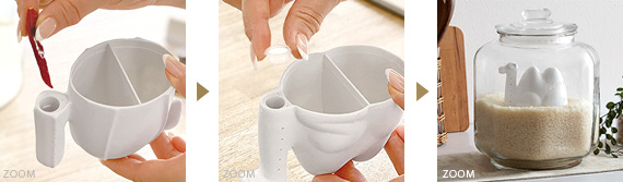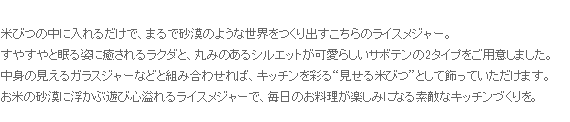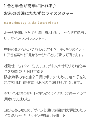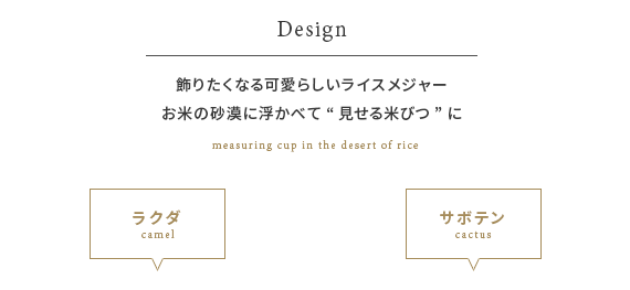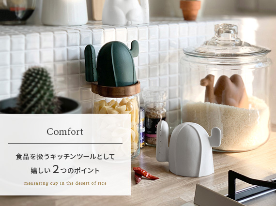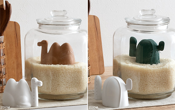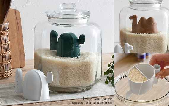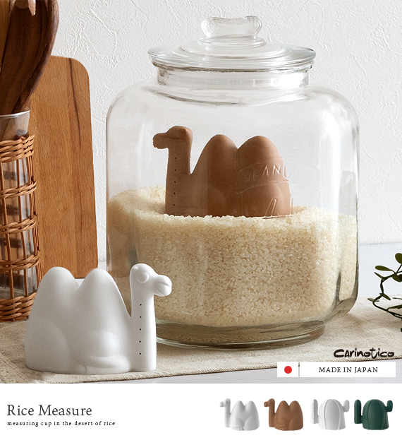 お米専用計量カップ carinotico rice measure(カリーノティコライスメジャー) / お米の砂漠にたたずむ姿に癒されるユニークで可愛らしいデザインのライスメジャー。中身の見える米びつと組み合わせて、キッチンのインテリア性を高める“見せる米びつ”として飾って頂けます。機能性にもすぐれており、カップ中央の仕切りで1合と半合を簡単に計り分け可能♪防虫効果のある唐辛子用のポケットもあり、唐辛子を入れておけば、飾りながらお米の虫除けもして頂けます。デザインはラクダとサボテンの2タイプで、それぞれ2カラーをご用意いたしました。遊び心ある癒しのデザインと便利な機能性が両立したライスメジャーで、キッチンを可愛く快適に♪