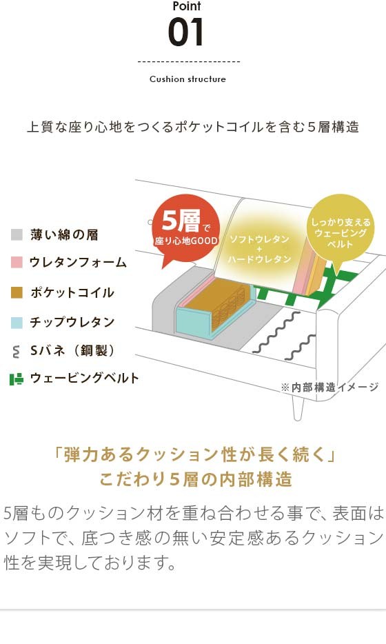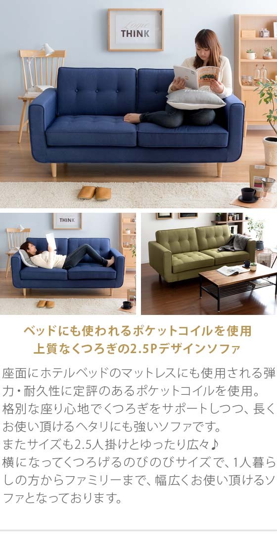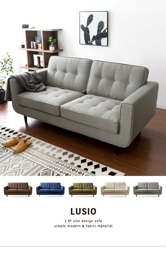2.5Pデザインソファ LUSIO(ルシオ) / 座面にホテルベッドのマットレスにも使用される弾力・耐久性に定評のあるポケットコイルを使用。格別な座り心地でくつろぎをサポートしつつ、長くお使い頂けるヘタリにも強いソファです。またサイズも2.5人掛けとゆったり広々♪横になってくつろげるのびのびサイズで、1人暮らしの方からファミリーまで、幅広くお使い頂けるソファとなっております。またお部屋に合わせ易いベーシックな形に、素材は優しい印象を与えるファブリック生地を採用。脚部には質感の良い、天然木脚部を合わせることで見た目のデザイン性も目を惹く仕上がりです。リビングを素敵に演出するデザインはもちろん、のびのびくつろげる快適サイズ&クッション性を兼ね備えたLUSIOでリビングをもっとお気に入りの場所に。