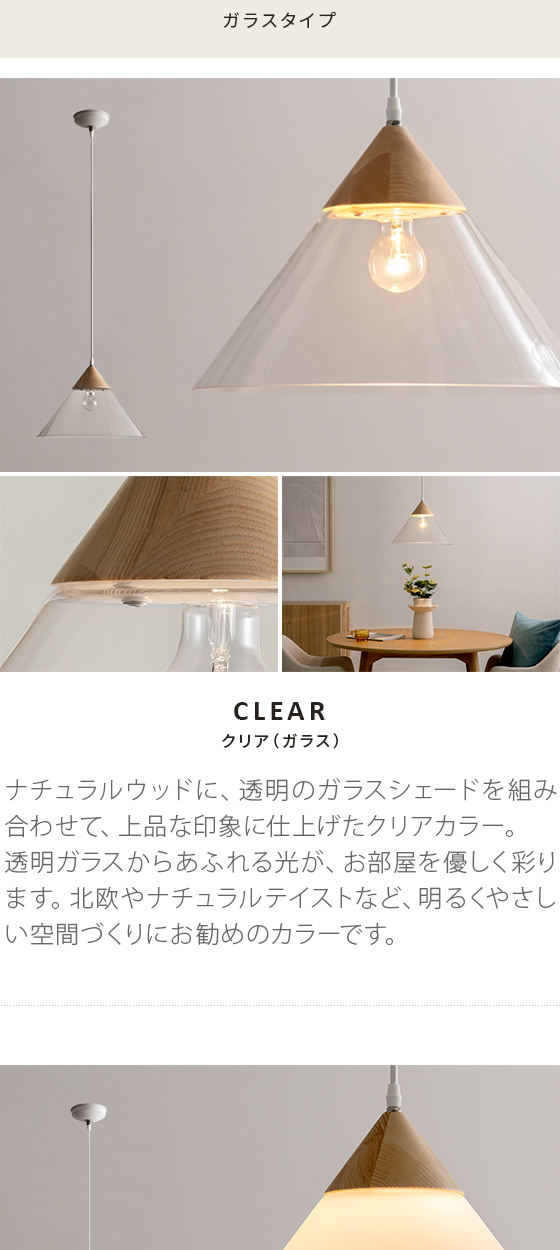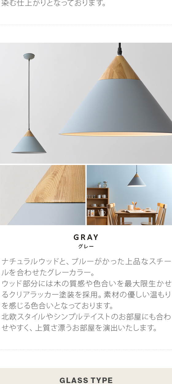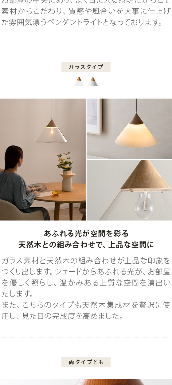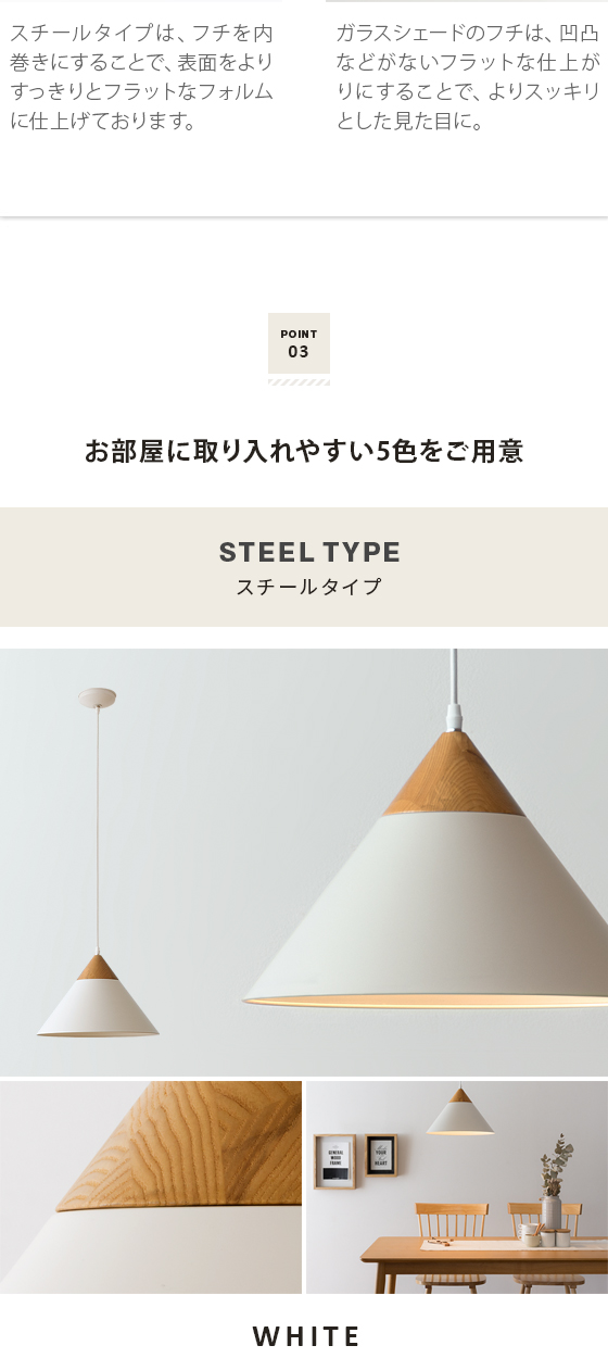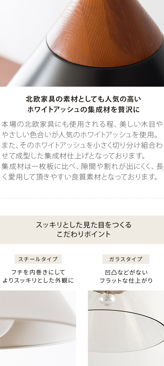 スチールシェードをベースに、アクセントに天然木集成材(ホワイトアッシュ)を組み合わせたスチールタイプ。ガラスシェードを使用したガラスタイプの2タイプをご用意。