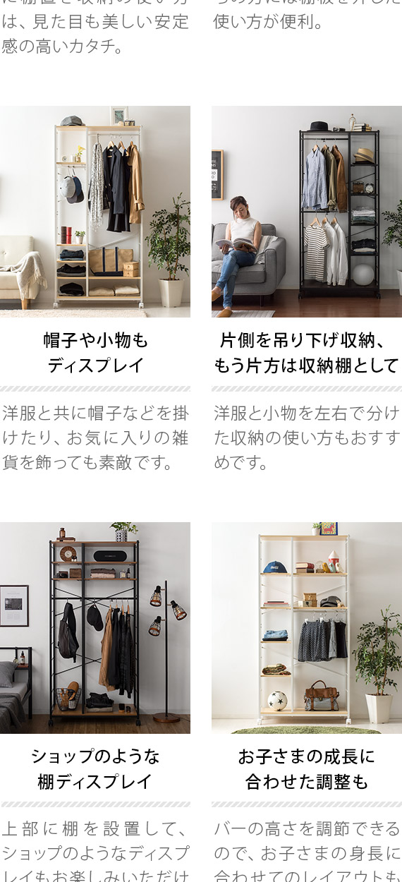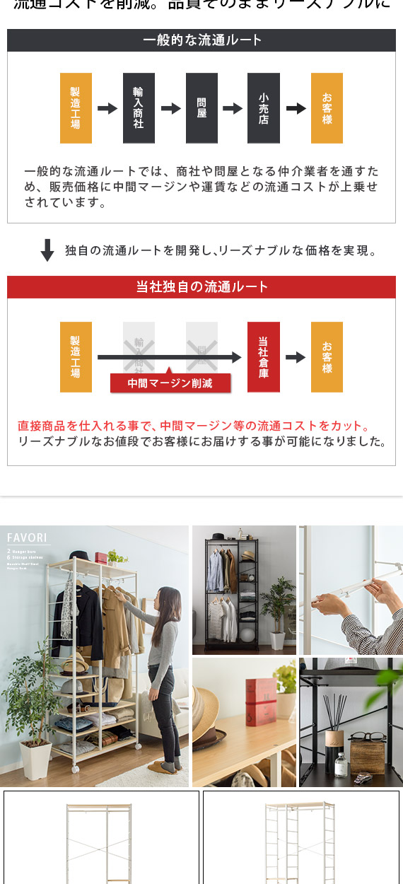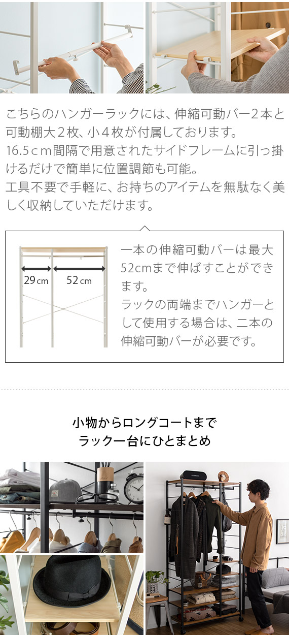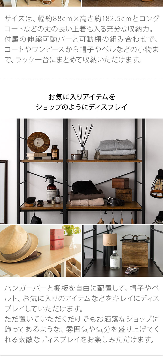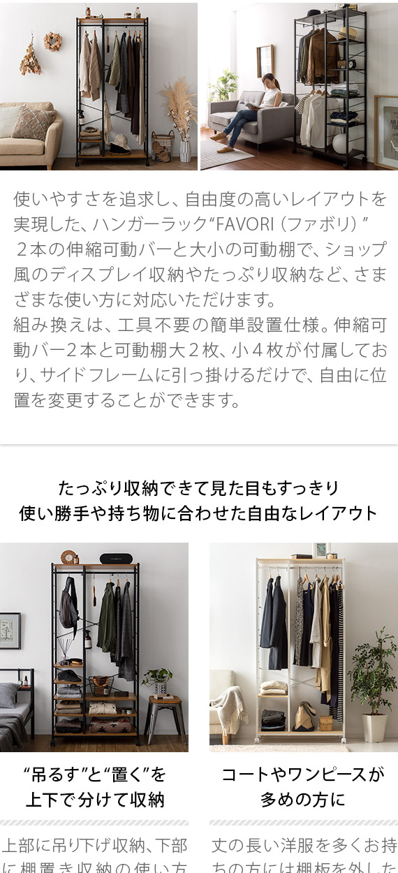 マルチハンガーラック FAVORI〔ファボリ〕 88cm幅タイプ / 使いやすさを追求し、自由度の高いレイアウトを実現した、ハンガーラック“FAVORI(ファボリ)”。2本の伸縮可動バーと大小の可動棚で、ショップ風のディスプレイ収納やたっぷり収納など、さまざまな使い方に対応いただけます。組み換えは、工具不要の簡単設置仕様。伸縮可動バー2本と可動棚大2枚、小4枚が付属しており、サイドフレームに引っ掛けるだけで、自由に位置を変更することができます。またサイズは、幅約88cm×高さ約182.5cmと丈の長い上着も入る充分な収納力。伸縮可動バーと可動棚の組み合わせで、コートやワンピースから帽子やベルなどの小物まで、ラック一台にまとめて収納可能です。収納力とディスプレイどちらも叶える多機能ハンガーラックで、快適な収納空間を。