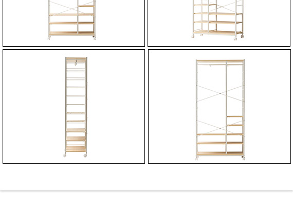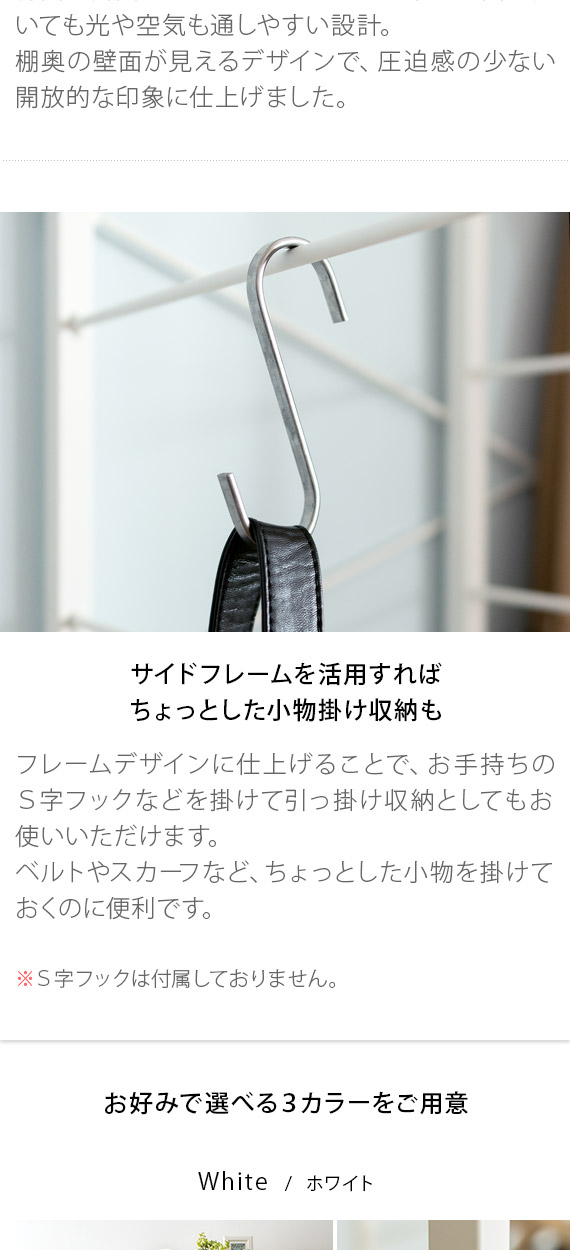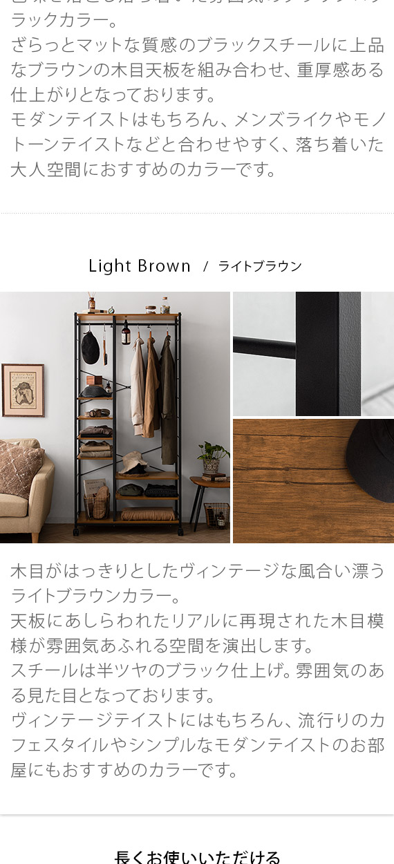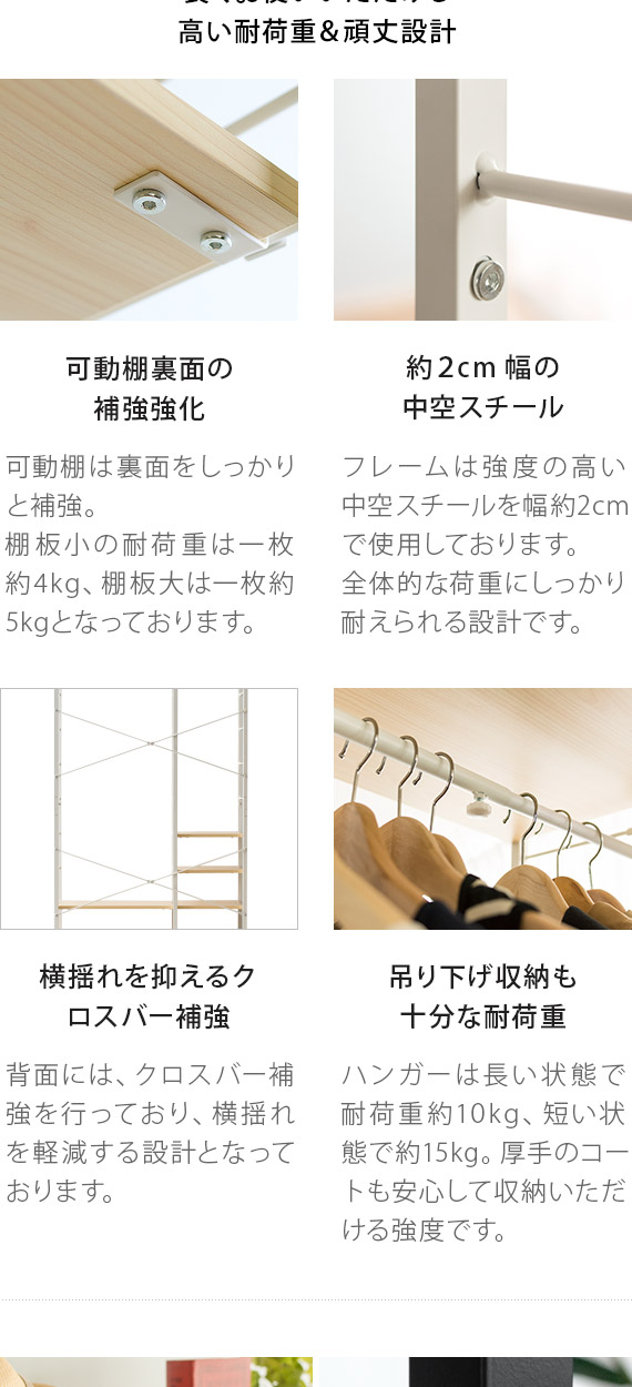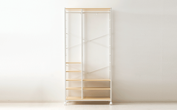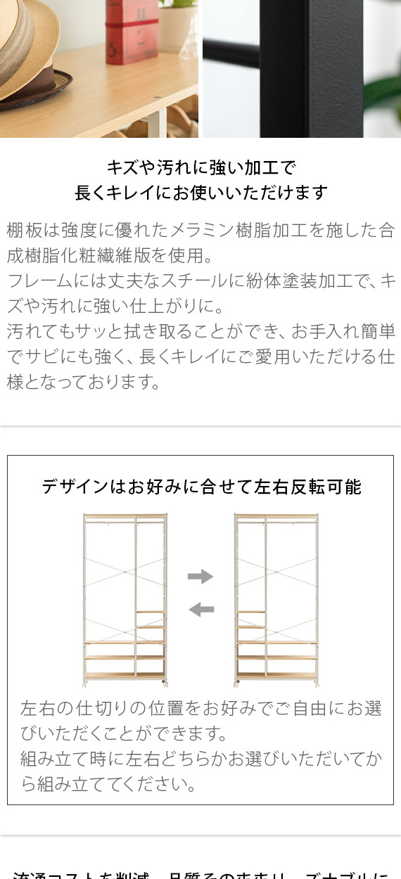 マルチハンガーラック FAVORI〔ファボリ〕 88cm幅タイプ / 使いやすさを追求し、自由度の高いレイアウトを実現した、ハンガーラック“FAVORI(ファボリ)”。2本の伸縮可動バーと大小の可動棚で、ショップ風のディスプレイ収納やたっぷり収納など、さまざまな使い方に対応いただけます。組み換えは、工具不要の簡単設置仕様。伸縮可動バー2本と可動棚大2枚、小4枚が付属しており、サイドフレームに引っ掛けるだけで、自由に位置を変更することができます。またサイズは、幅約88cm×高さ約182.5cmと丈の長い上着も入る充分な収納力。伸縮可動バーと可動棚の組み合わせで、コートやワンピースから帽子やベルなどの小物まで、ラック一台にまとめて収納可能です。収納力とディスプレイどちらも叶える多機能ハンガーラックで、快適な収納空間を。