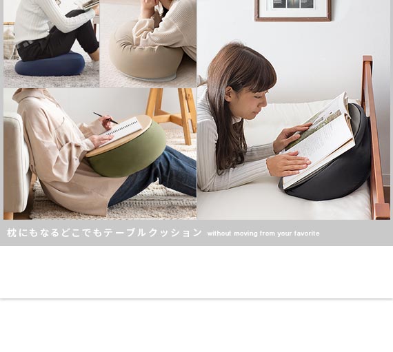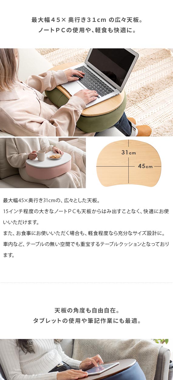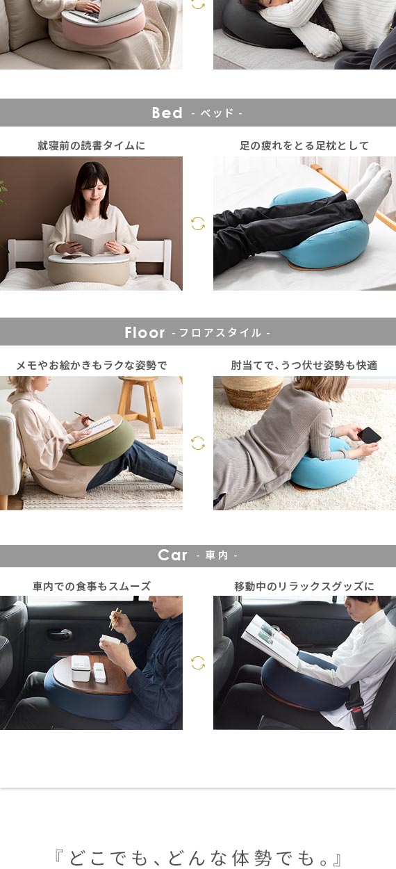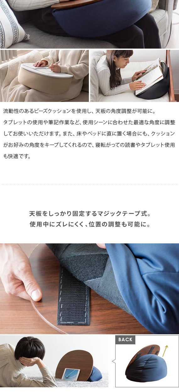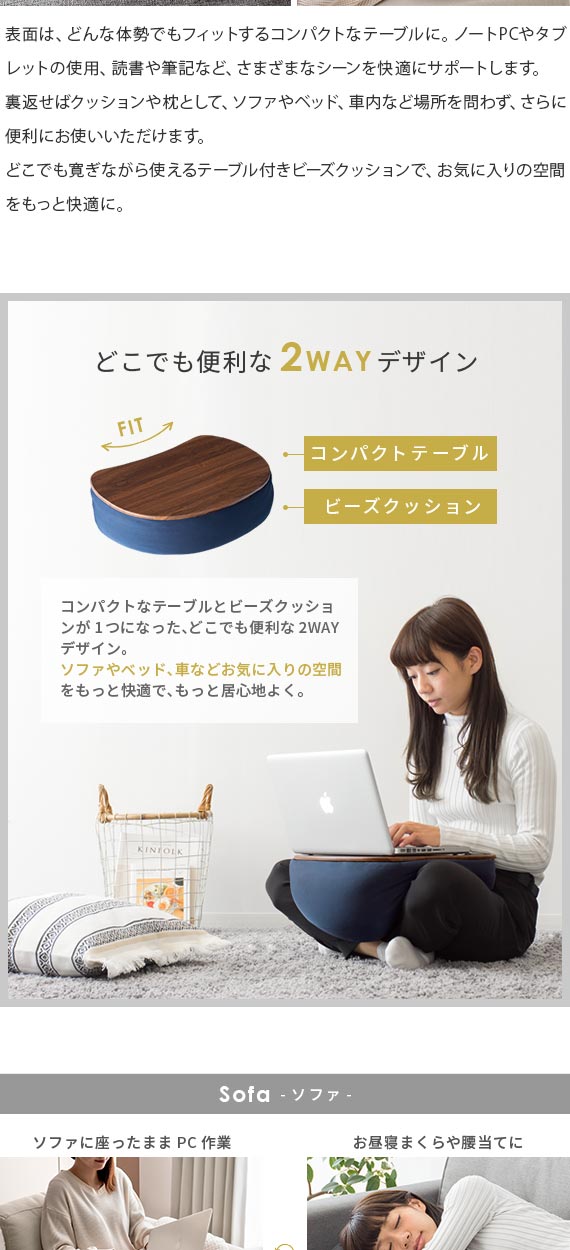 枕にもなるどこでもテーブルクッション / もっちり快適なビーズクッションに、テーブル機能をプラスした2WAYデザイン。表面は、どんな体勢でも体にフィットするコンパクトなテーブルに。ノートPCやタブレットの使用、読書や筆記作業、軽いお食事まで、さまざまなシーンを快適にサポートいたします。裏返せばクッションや枕として、ソファやベッド、車内など場所を問わず、さらに便利にお使い頂けます。どこでも寛ぎながら使えるクッションテーブルで、お気に入りの空間をもっと居心地よく、快適に。