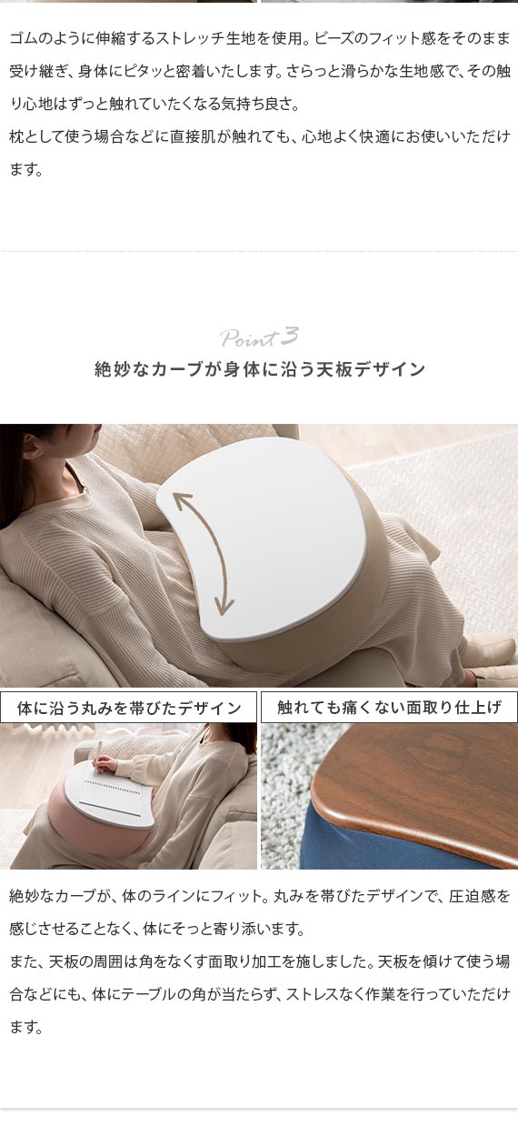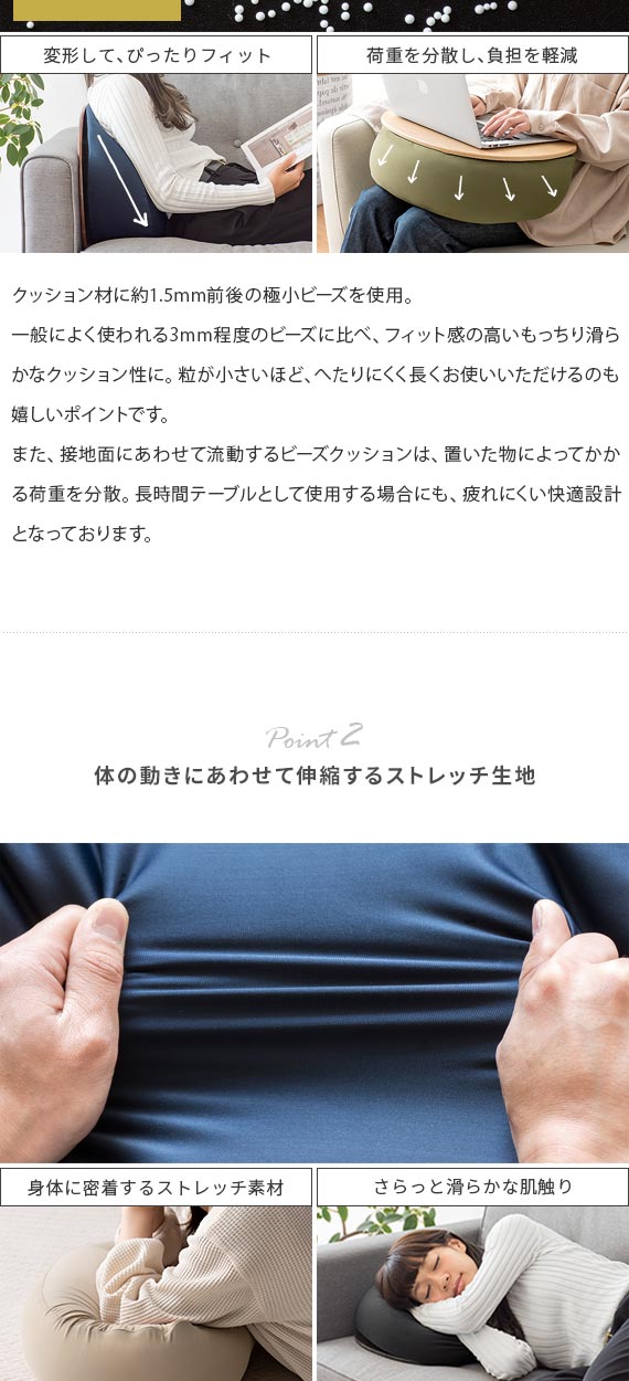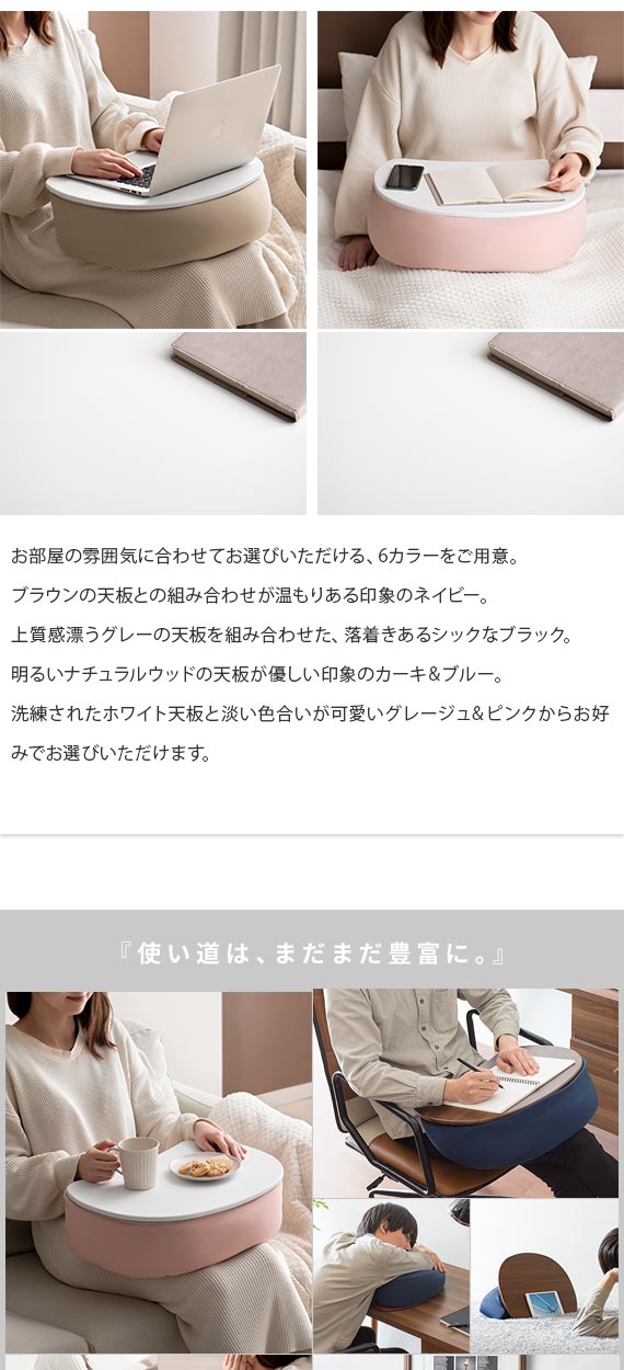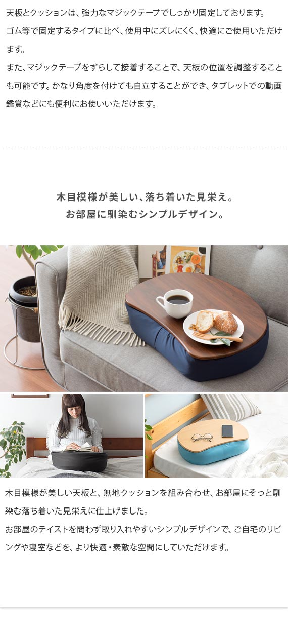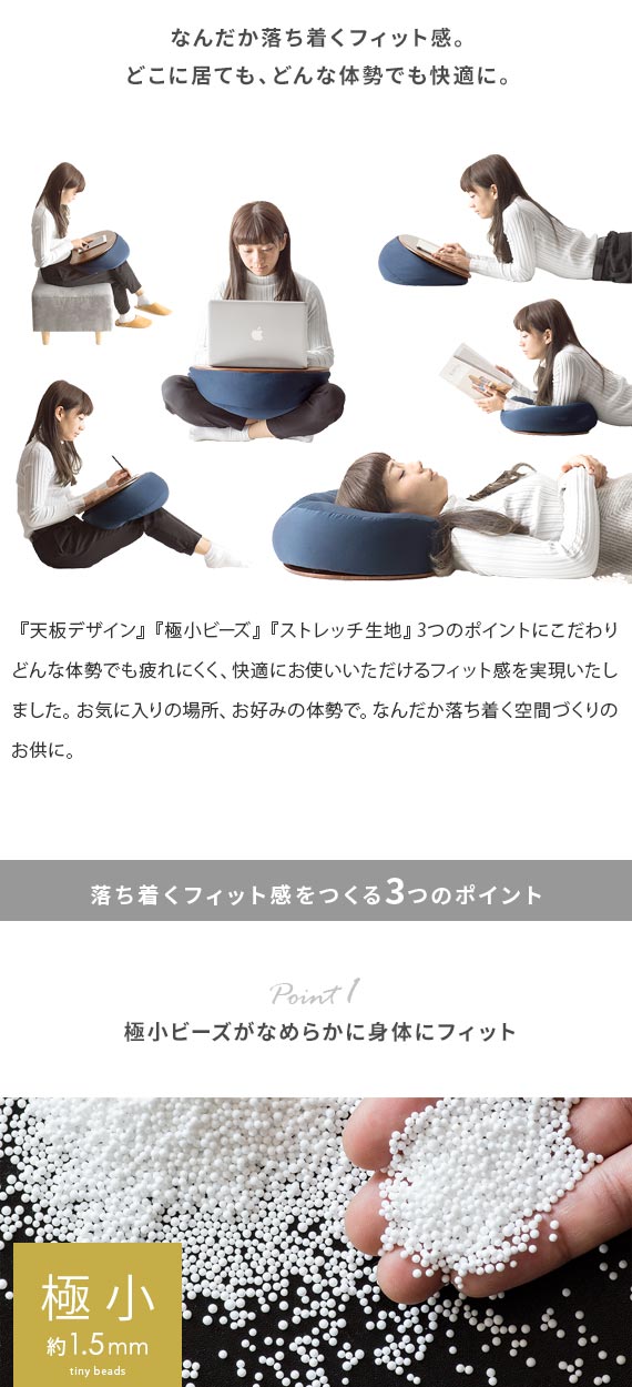 枕にもなるどこでもテーブルクッション / もっちり快適なビーズクッションに、テーブル機能をプラスした2WAYデザイン。表面は、どんな体勢でも体にフィットするコンパクトなテーブルに。ノートPCやタブレットの使用、読書や筆記作業、軽いお食事まで、さまざまなシーンを快適にサポートいたします。裏返せばクッションや枕として、ソファやベッド、車内など場所を問わず、さらに便利にお使い頂けます。どこでも寛ぎながら使えるクッションテーブルで、お気に入りの空間をもっと居心地よく、快適に。