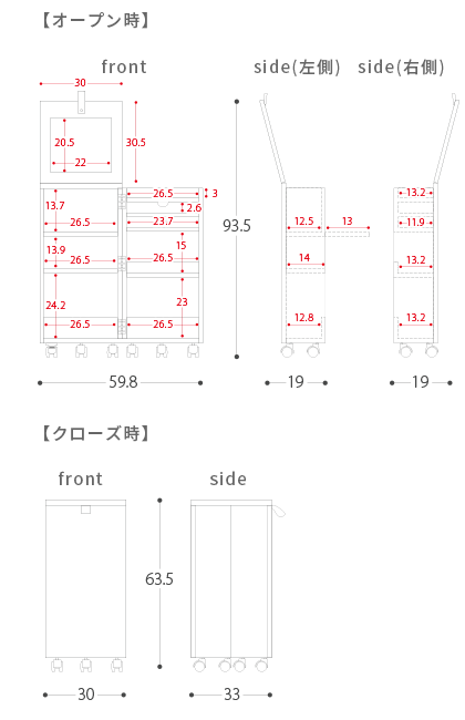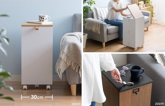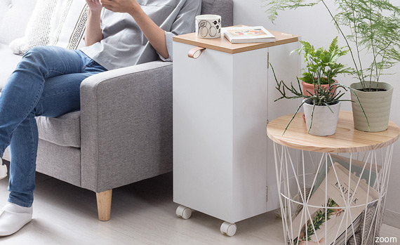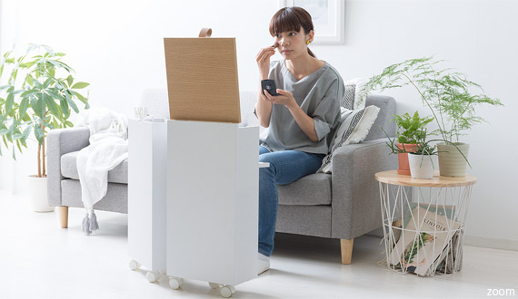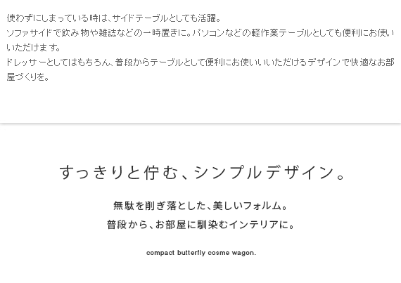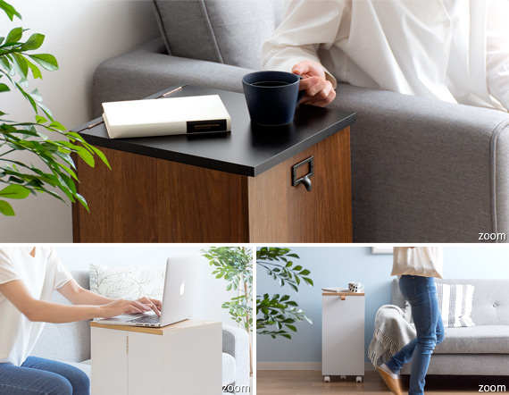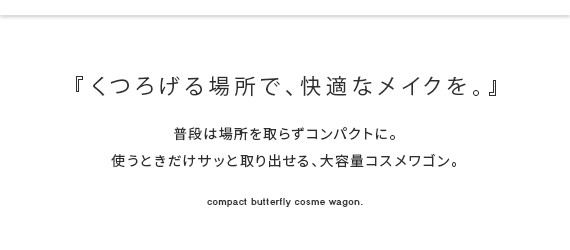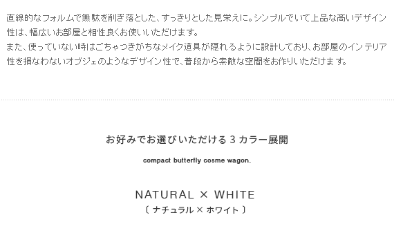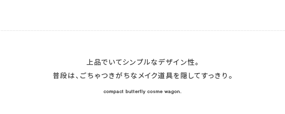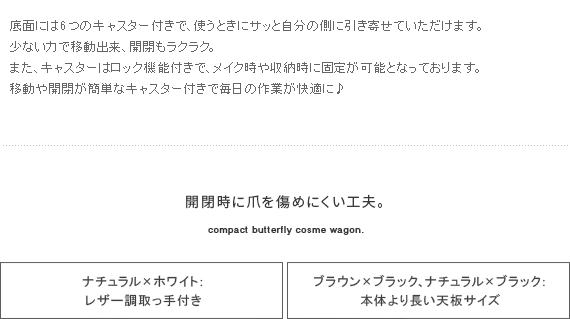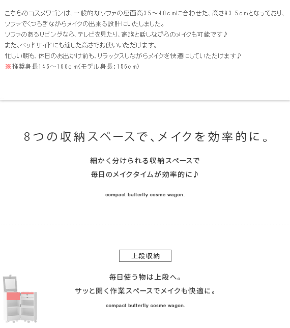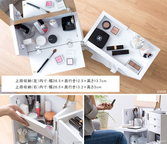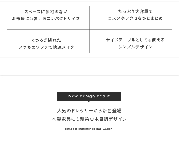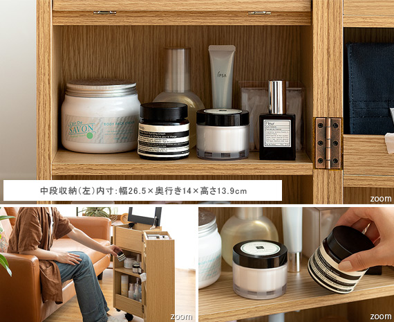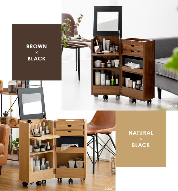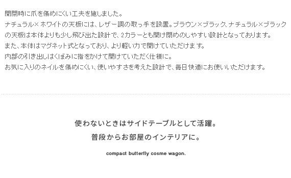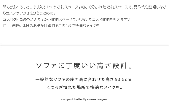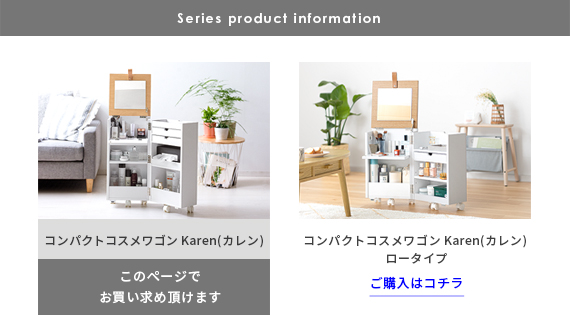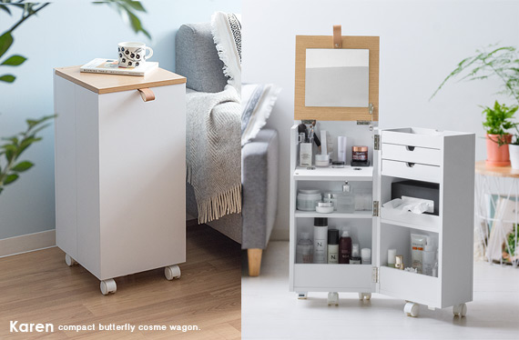 コンパクトコスメワゴン Karen(カレン) [本体完成品] / 普段はコンパクト、使うときだけ大容量のドレッサーとして使えるコスメワゴン”Karen(カレン)”一般的なソファの座面高に合わせた設計で、ソファでくつろぎながら、快適メイク♪忙しい朝や休日のお出かけ準備を、くつろぎ慣れた場所で行っていただけます。普段はコンパクトに佇み、ごちゃつきやすいメイク道具も隠して収納します。サイドテーブルとしてもお使いいただける、無駄なく使えるデザイン性に。コンパクトでありながら、収納力はたっぷりあり、開くと大容量の8つの収納スペースが現れます♪メイクやアクセをこの一台にひとまとめに。ソファでくつろぎながら、快適なメイクを行えるコンパクトなコスメワゴンで毎日のメイクを快適に♪