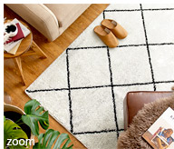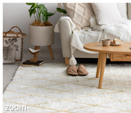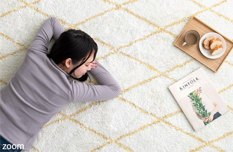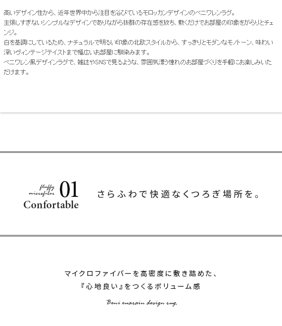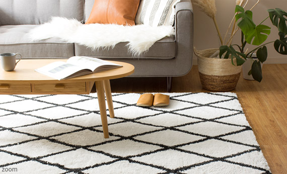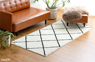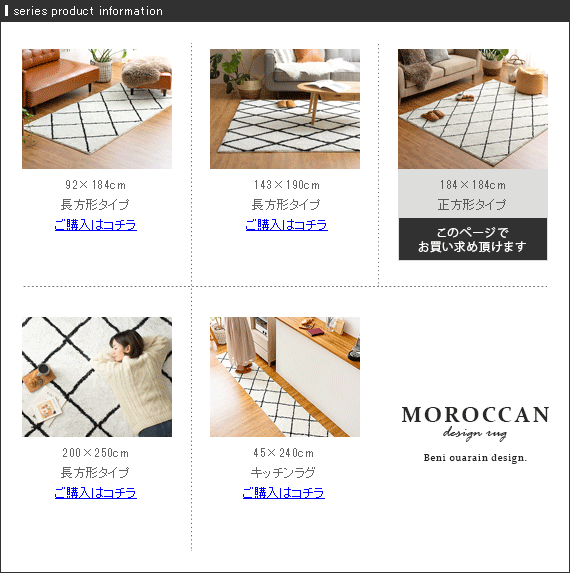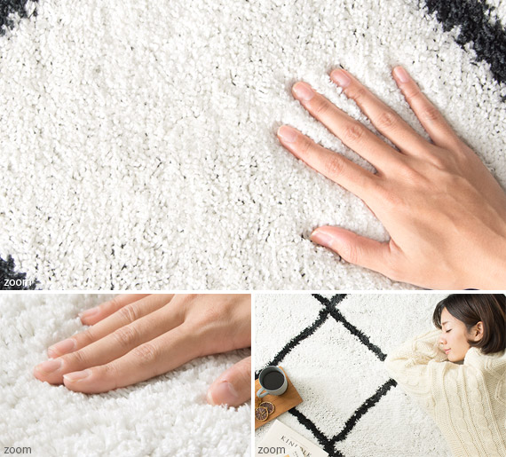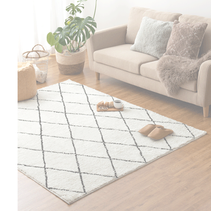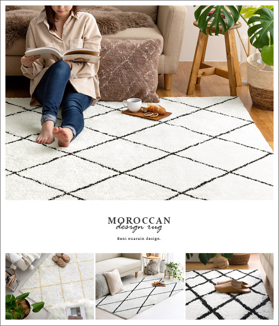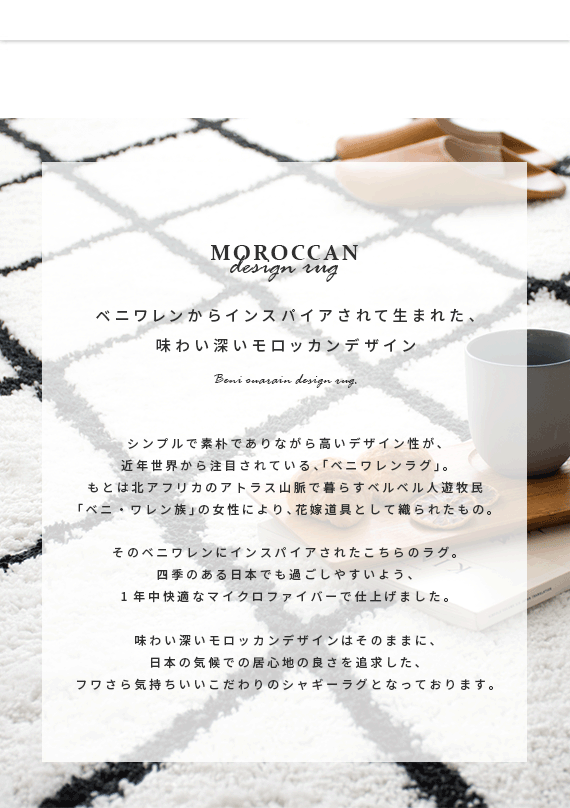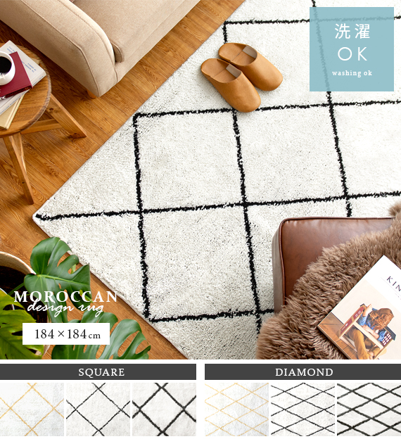 ベニワレン風モロッカンデザインラグ 184×184cm / 世界中から注目されている、ベニワレンラグ。本物のベニワレンラグはウール100%でつくられますが、こちらのラグは四季のある日本でも一年中快適にお過ごしいただけるようマイクロファイバーを採用。短めの毛足をたっぷり高密度に敷き詰めたふかふかのボリューム感で、『ふわふわ』『さらさら』な心地よい肌触りを実現しました。