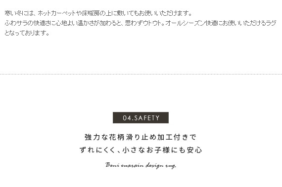 関連カテゴリ: オリジナル家具 > ラグ(オリジナル家具) | ラグ > 洗えるラグ | ラグ > 滑り止め付きラグ | ラグ > ホットカーペット・床暖対応ラグ | ラグ > デザインラグ・柄物