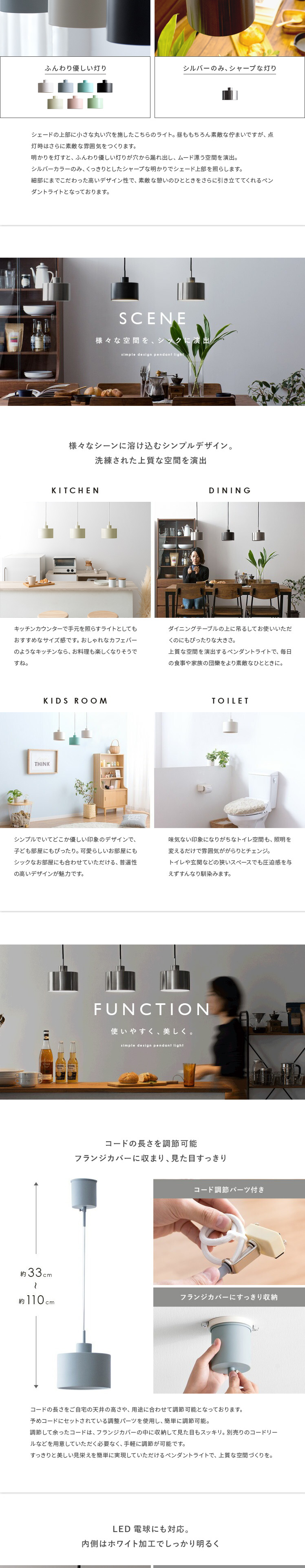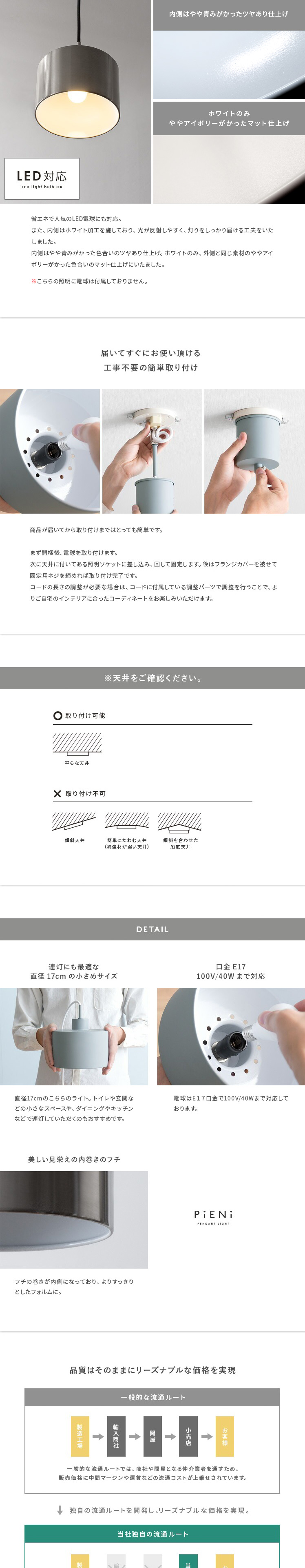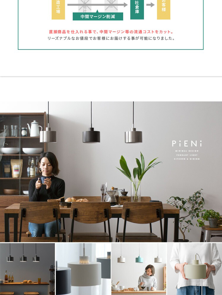 ペンダントライト Pieni〔ピエニ〕 1灯コンパクトタイプ / 無駄な装飾を一切省いた、すっきりとしたフォルムのシンプルモダンペンダントライト”PIENI(ピエニ)”。既存のインテリアに取り入れやすいシンプルデザインで、様々なテイストにマッチ。明かりとしてはもちろん、インテリアとしても映えるペンダントライトで、洗練された落ち着きのある空間づくりを。