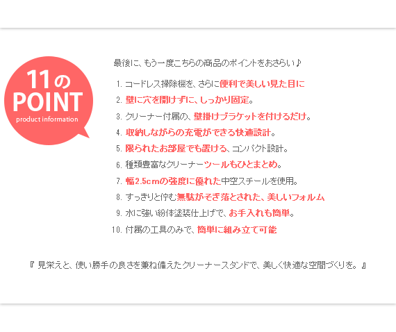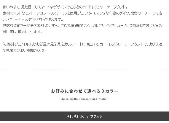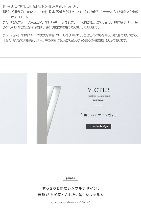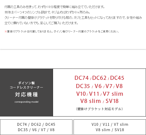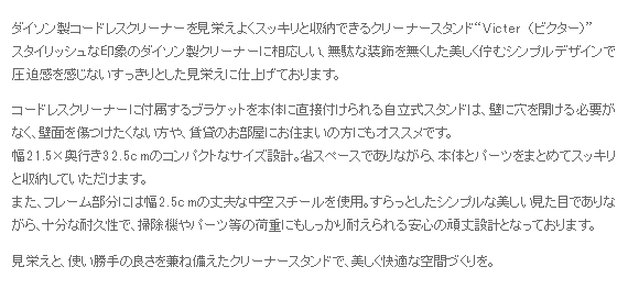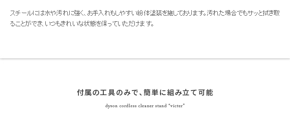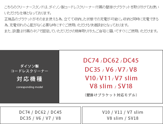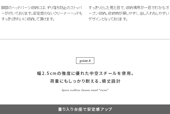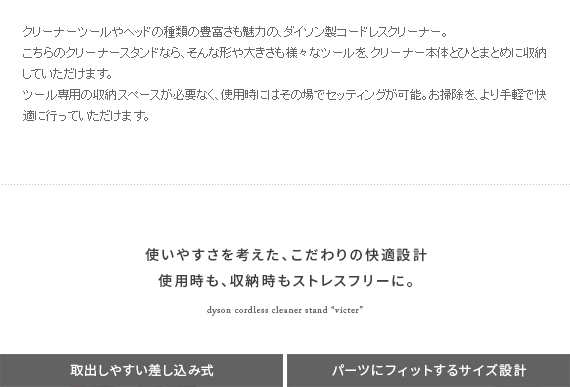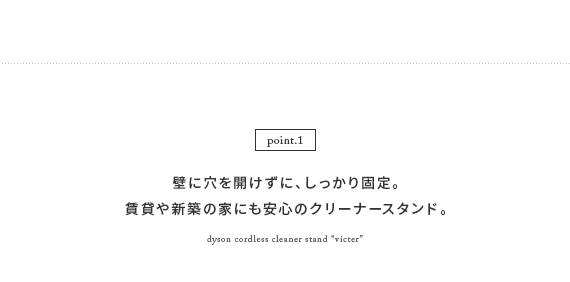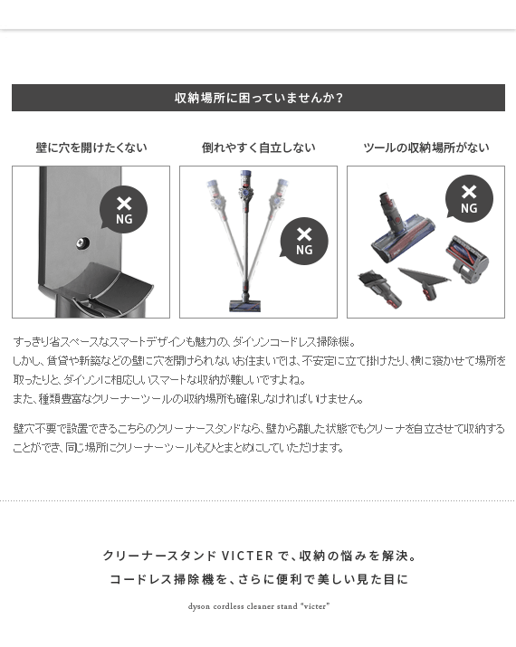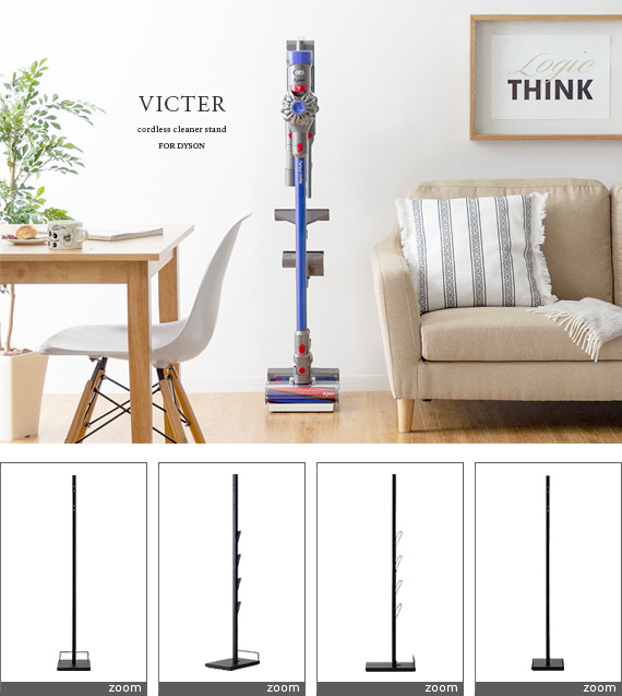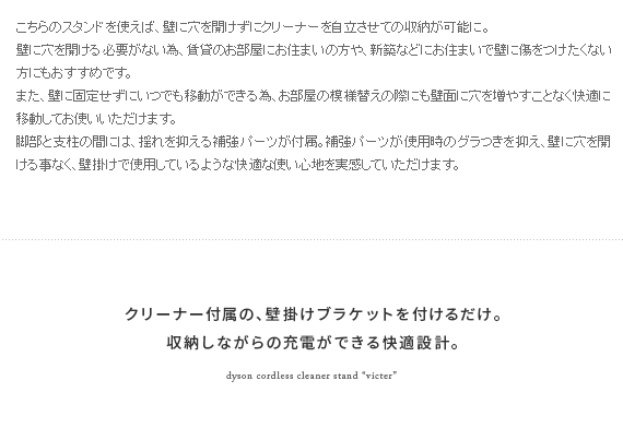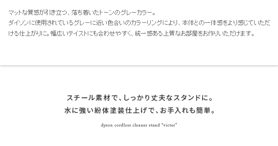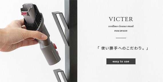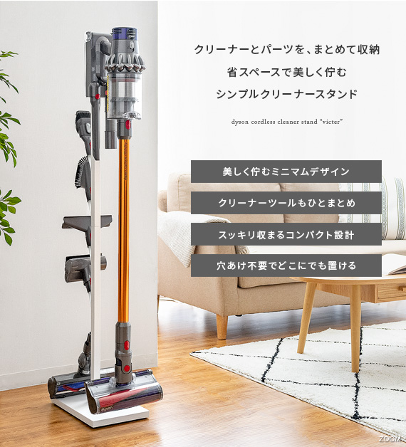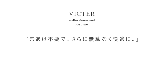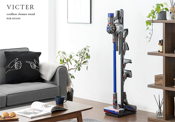 ダイソン製コードレスクリーナーを見栄えよくスッキリと収納できるクリーナースタンド“Victer (ビクター)” スタイリッシュな印象のダイソン製クリーナーに相応しい、無駄な装飾を無くした美しく佇むシンプルデザインで圧迫感を感じないすっきりとした見栄えに仕上げております。穴あけ不要だから賃貸でも安心。掃除機本体とパーツをまとめて収納できるシンプルクリーナースタンドです。