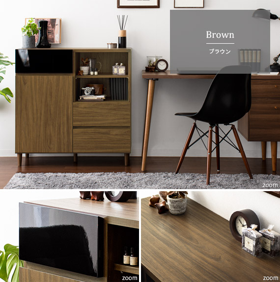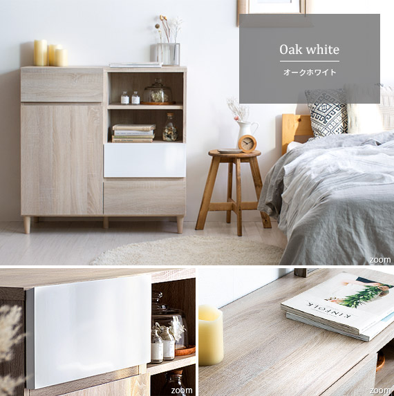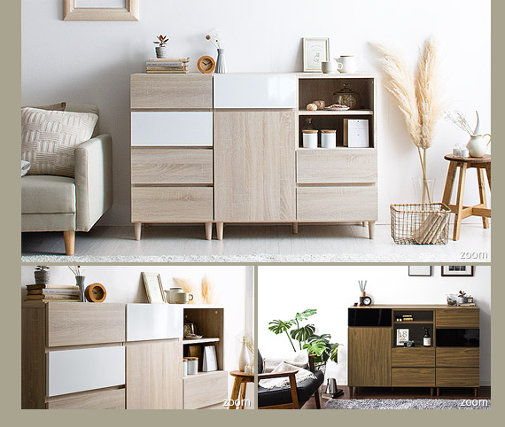 キャビネット HELM(ヘルム)/扉収納と引き出し収納で、生活感の出やすい雑多な収納物を手軽にすっきり美しく“隠す収納”を。オープン棚と天板には、お好みの雑貨や小物などを収納し“魅せる収納”を。「隠す」と「魅せる」の2つの収納で、お部屋を素敵に便利にしてくれるHELMキャビネットです。扉収納とオープン棚は、取り外しも可能な可動棚が付いており、収納物に合わせた細かな高さ調整が可能なほか、3杯の引き出し収納は、リビング周りの小物収納や書類整理(A4サイズ対応)に最適です。扉収納には配線孔もあり、生活感が出るルーターなども収納が可能に。また、デザイン性にもこだわりました。立体的で美しい木目模様にこだわったデザインと、お好みによって好きな位置に移動可能な鏡面のアクセントパネルを組み合わせ、お部屋が落ち着きあるすっきりとした空間に。たっぷり収納しても、見栄えはすっきり美しく。お部屋の雰囲気を変える質の良いキャビネットで、洗練された上品な空間作りを。