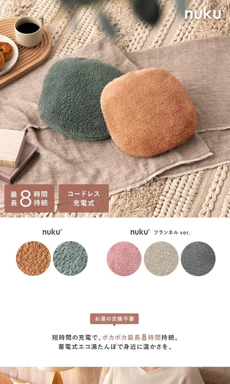 蓄熱式エコ湯たんぽ「ぬくぬく」/どこにでも持ち運べて繰り返し使えるエコ湯たんぽ。面倒なお湯の入れ替えは不要。約15分充電するだけで最長約8時間温かさが持続します。湯たんぽ本体はぷにぷにとした柔らかい感触。身体にしっかりと密着してくれます。保温カバーはふわふわとした手触りのノーマル、なめらかな手触りのフランネル生地の2種類からお選びいただけます♪