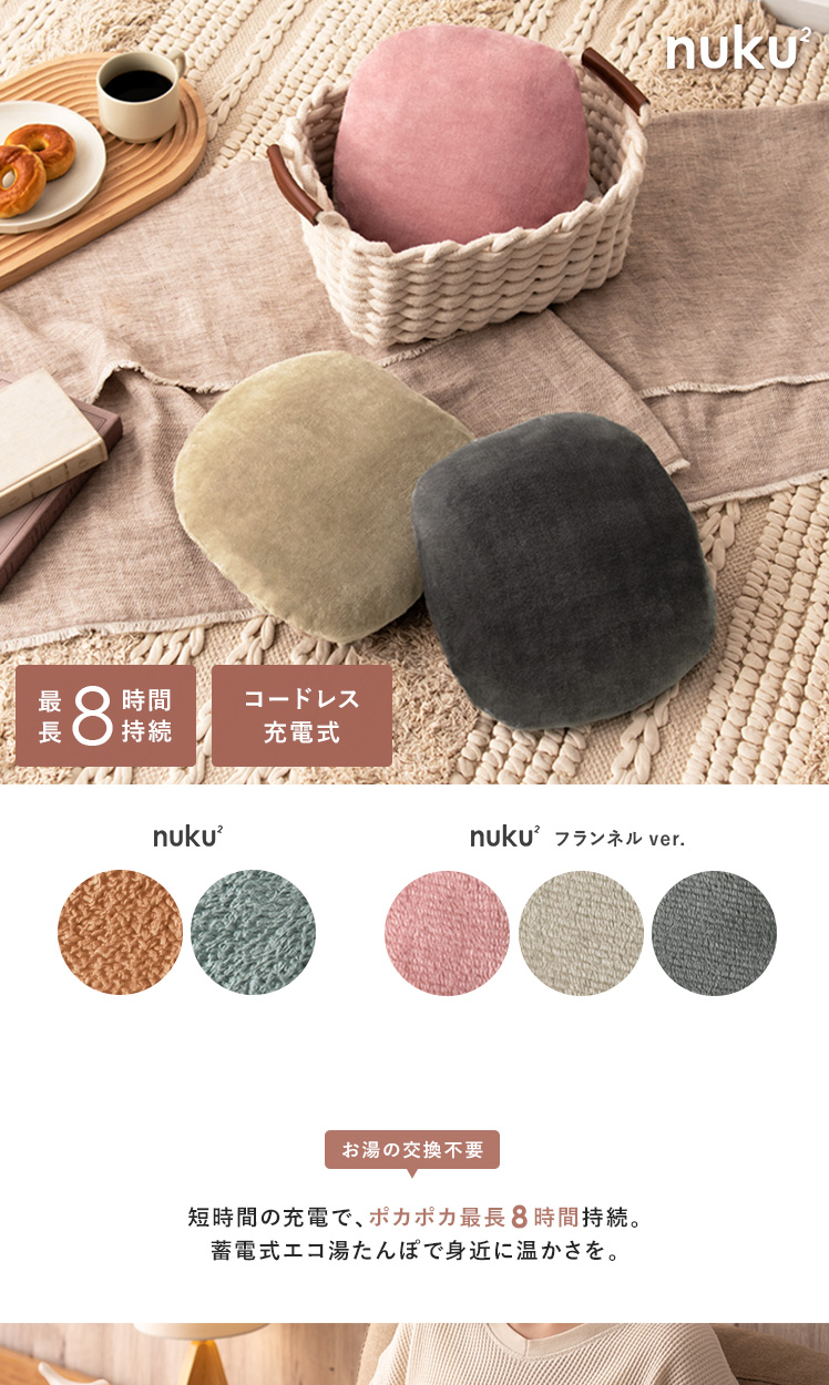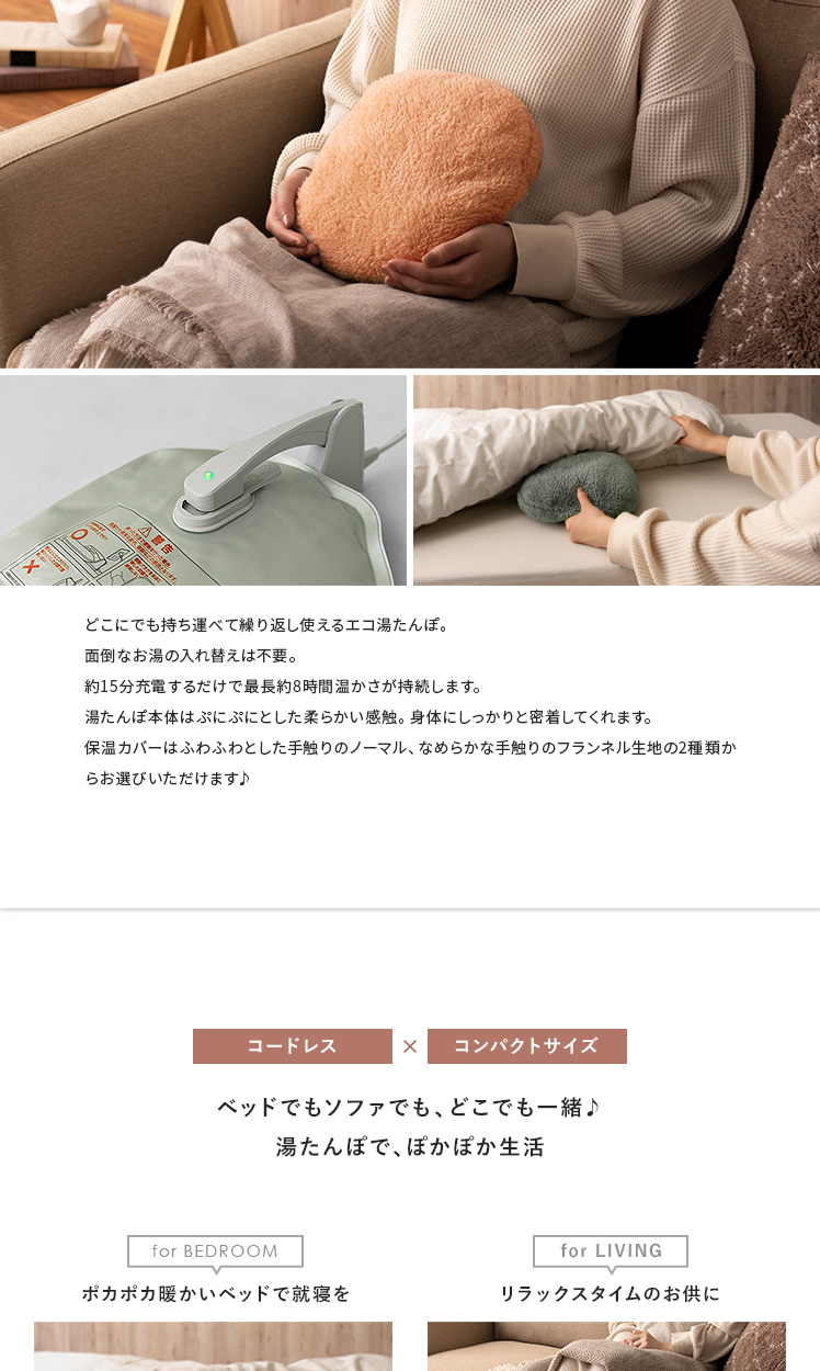 蓄熱式エコ湯たんぽ「ぬくぬく」 フランネルVer./どこにでも持ち運べて繰り返し使えるエコ湯たんぽ。面倒なお湯の入れ替えは不要。約15分充電するだけで最長約8時間温かさが持続します。湯たんぽ本体はぷにぷにとした柔らかい感触。身体にしっかりと密着してくれます。保温カバーはふわふわとした手触りのノーマル、なめらかな手触りのフランネル生地の2種類からお選びいただけます♪
