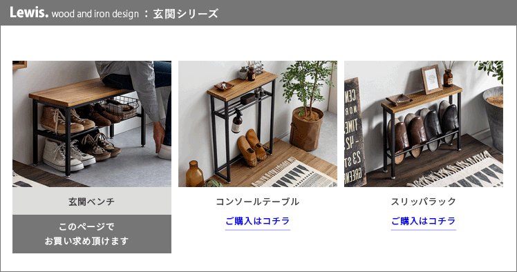 ヴィンテージウッド収納付きベンチ Lewis(ルイス) / 風合いある天然木にマットなフレームを組み合わせた、ヴィンテージな雰囲気漂う収納付き玄関ベンチ"Lewis(ルイス)"。靴の脱ぎ・履きをスムーズに行える"Lewis bench"が、快適で、雰囲気ある玄関をおつくりします。座り込んだり、立ったままではしづらい、毎日の靴の脱ぎ・履きを快適にサポートし、お出かけ、帰宅時の動作をよりスムーズに行っていただけます。収納スペースには、スニーカーなどの靴が最大6足収納可能。靴の脱ぎ履きが快適に行える上に、収納スペースも確保でき、1台2役で快適な空間をおつくりいただける玄関ベンチとなっております。また、素材面にもしっかりとこだわっております。棚板のウッド素材は使う程に馴染んでいくパイン材を使用。くっきりとした木目が美しく、木の質感・風合いを感じられる仕上がりとなっております。フレームにはマットなブラックフレームを。程良い重厚感がビターなアクセントに。ヴィンテージ感漂う、ラフでカジュアルなデザインに仕上げました。