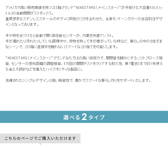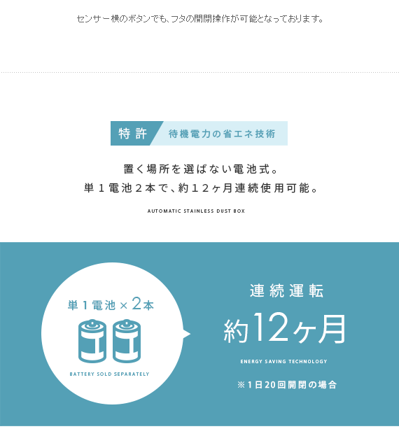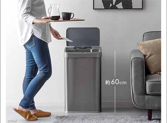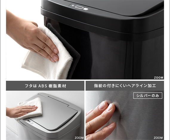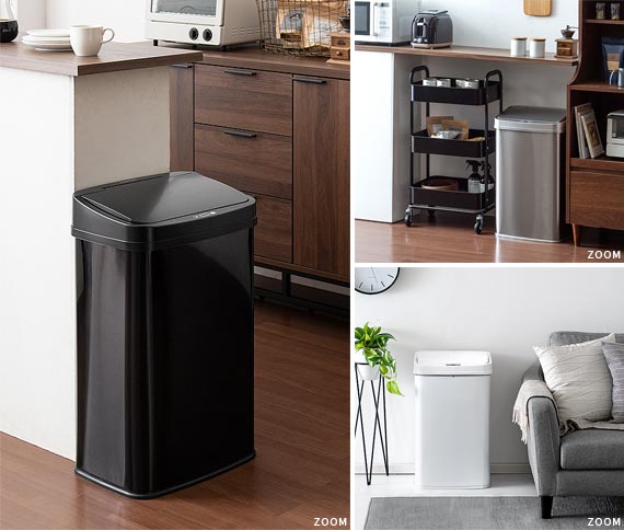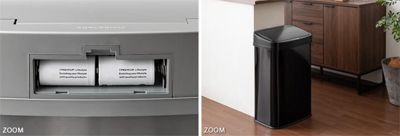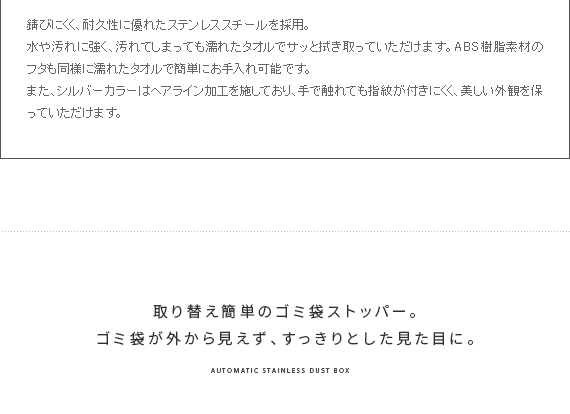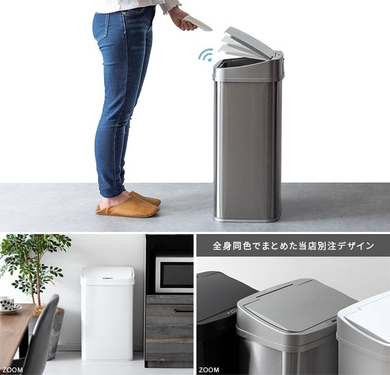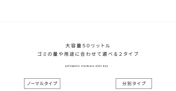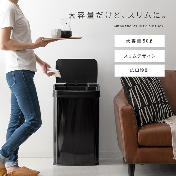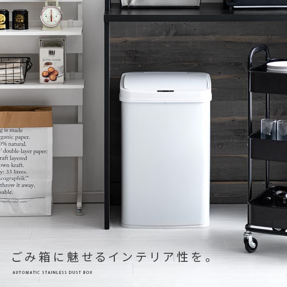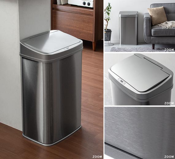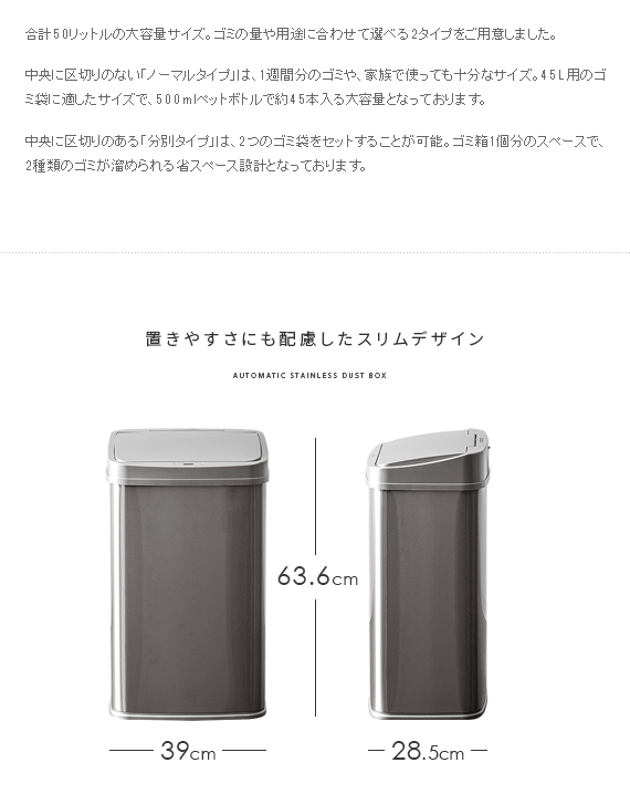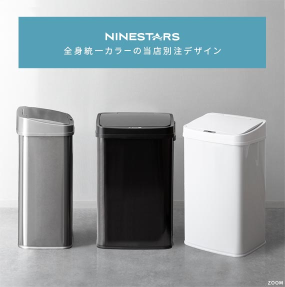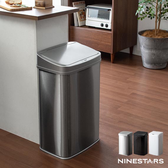 NINE STARS〔ナインスター〕 自動開閉ダストボックス 50L ノーマルタイプA /アメリカで高い販売実績を持つゴミ箱ブランド“NINESTARS(ナインスター)”が手掛ける大容量50L(リットル)の自動開閉ダストボックス。重厚感あるステンレススチールのボディに同色のフタを合わせた、全身モノトーンカラーの当店別注デザインとなっております。手や物を近づけると自動で開く高性能センサーが、作業を快適アシスト。手が濡れたり汚れたりしている調理中や、荷物を持って手が塞がっている時など、暮らしの中のさまざまなシーンで、ゴミ箱に直接手を触れないスマートなゴミ捨てを可能にします。“NINESTARS(ナインスター)”ブランドならではの高い技術力で、開閉音を静かにするソフトクローズ機能、センサーの感知距離の調整機能、5万回の開閉テストをクリアする耐久性、単1電池2本で約1年使える省エネ設計などを備えたハイクオリティな製品に。洗練されたシンプルデザインと高い機能性で、豊かでスマートな暮らし作りをサポートいたします。