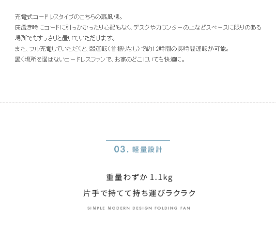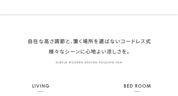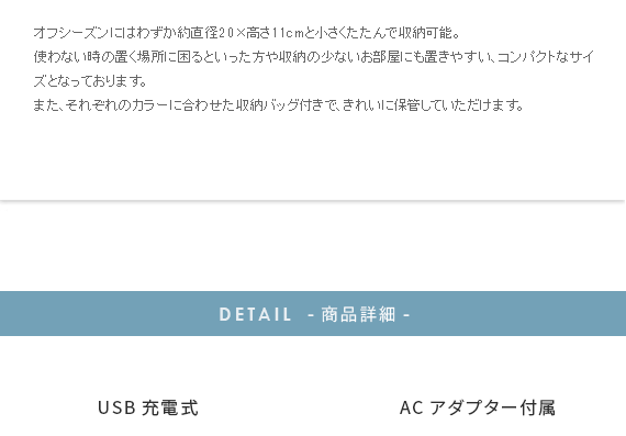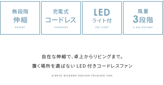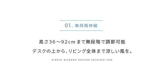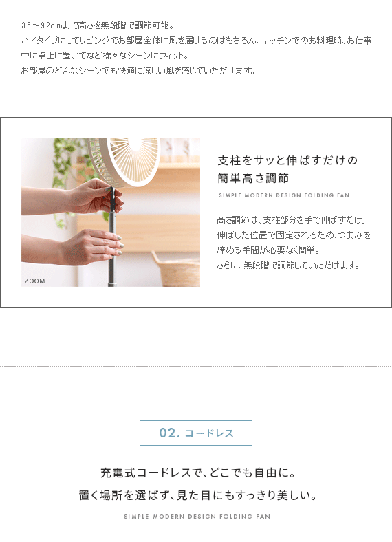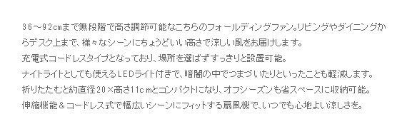 コードレス式 マルチフォールディングファン /36〜92まで無段階で高さ調節可能なこちらのフォールディングファン。リビングやダイニングからデスク上まで、様々なシーンにちょうどいい高さで涼しい風をお届けします。充電式コードレスタイプとなっており、場所を選ばずすっきりと設置可能。ナイトライトとしても使えるLEDライト付きで、暗闇の中でつまづいたりといったことも軽減します。折りたたむと約直径20×高さ11cmとコンパクトになり、オフシーズンも省スペースに収納可能。伸縮機能&コードレス式で幅広いシーンにフィットする扇風機で、いつでも心地よい涼しさを。