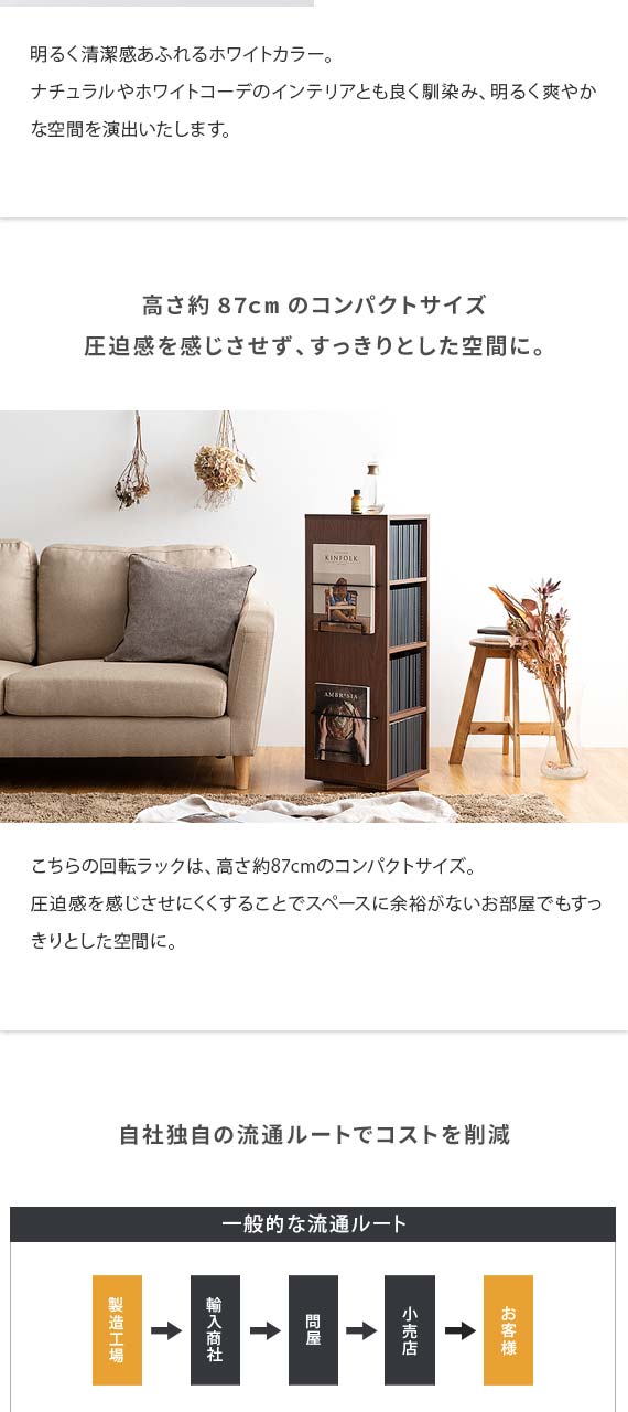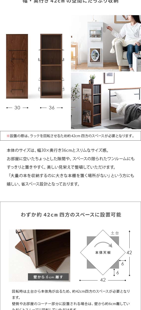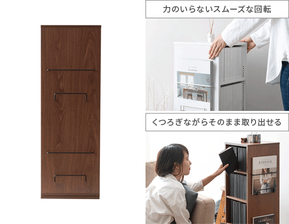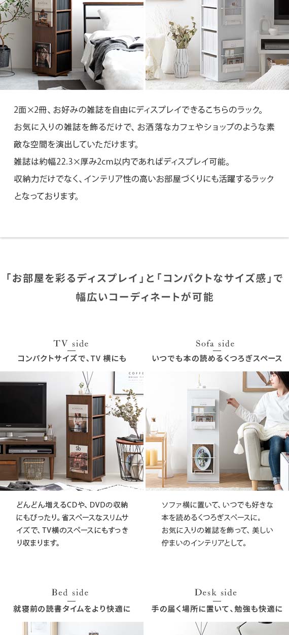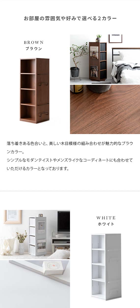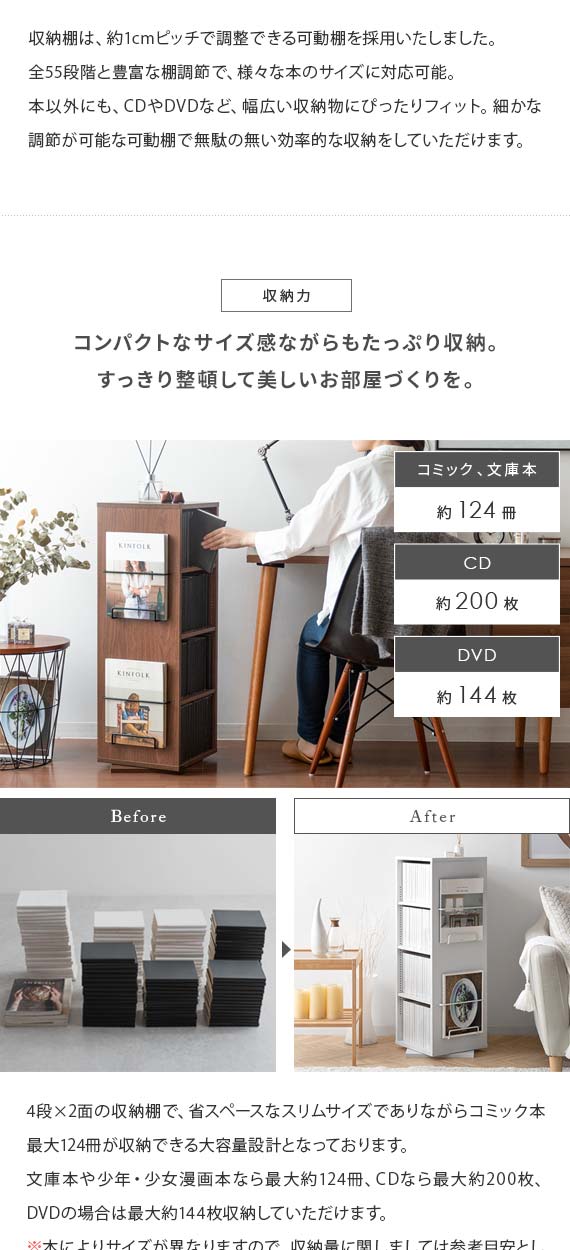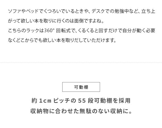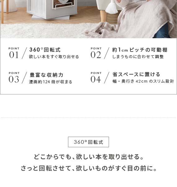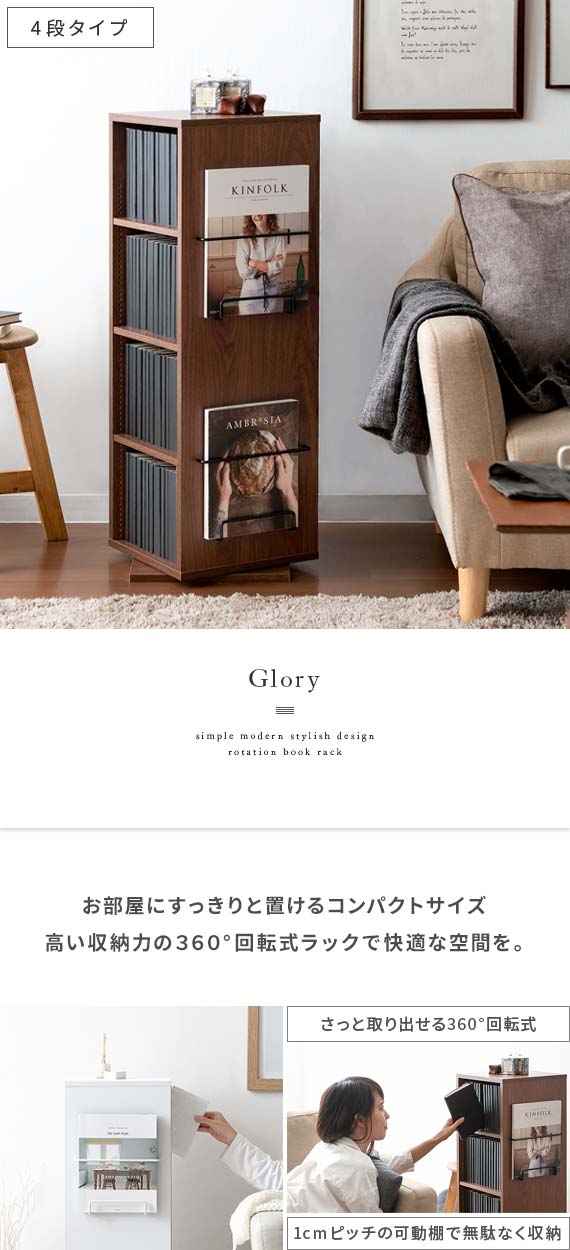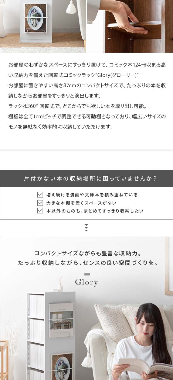 360度回転式コミックラック Glory(グローリー) 4段タイプ / お部屋のわずかなスペースにすっきり置けて、コミック本124冊収まる高い収納力を備えた回転式コミックラック”Glory(グローリー)”お部屋に置きやすい高さ87cmのコンパクトサイズで、たっぷりの本を収納しながらお部屋をすっきりと演出します。ラックは360°回転式を採用しており、くるくると回すだけで、どこからでも欲しい本を取り出し可能。棚板は全て1cmピッチで調整できる可動棚となっており、幅広いサイズのモノを無駄なく効率的に収納していただけます。