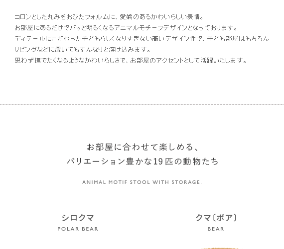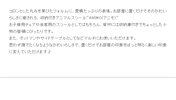 収納付きアニマルスツール ANIMO(アニモ)Mサイズ Aタイプ / コロンとした丸みを帯びたフォルムに、愛嬌たっぷりの表情。お部屋に置くだけでそのかわいらしさに癒される、収納付きアニマルスツール”ANIMO(アニモ)”お子様用チェアや来客用のスツールとしてはもちろん、背中には収納庫付きでちょっとした小物の整頓にぴったりです。また、オットマンやサイドテーブルとしてなどマルチにお使いいただけます。思わず撫でたくなるようなかわいらしさで、置くだけでお部屋の印象をぱっと明るく楽しい印象に変えていただけます♪