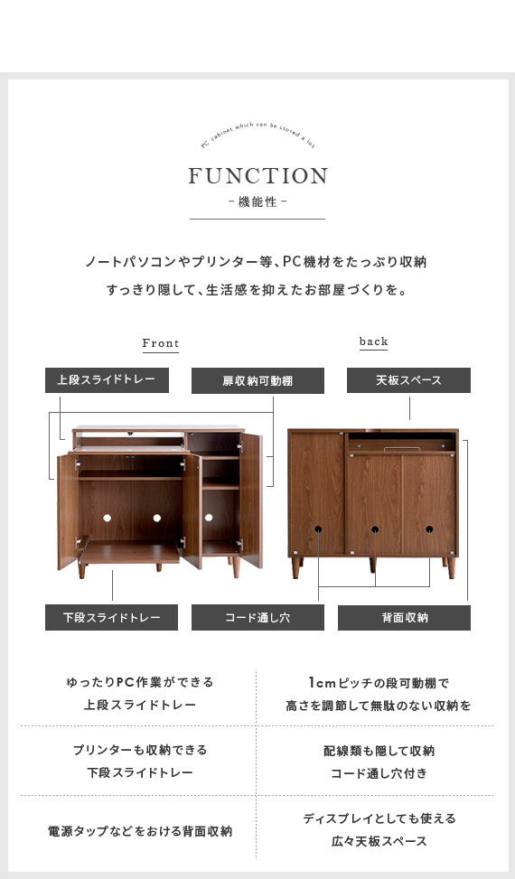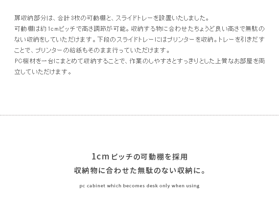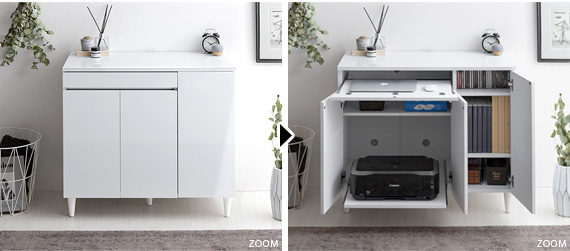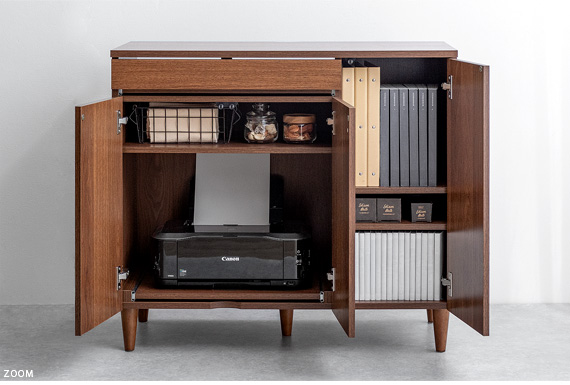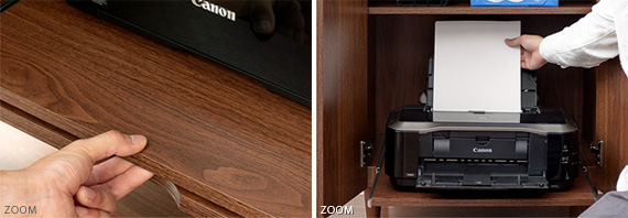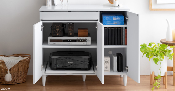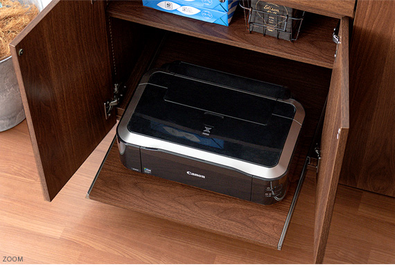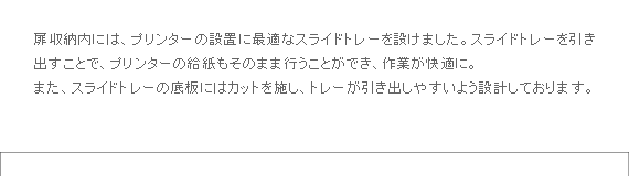 扉収納内には、プリンターの設置に最適なスライドトレーを設けました。