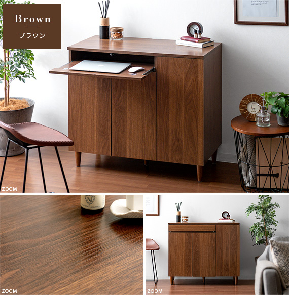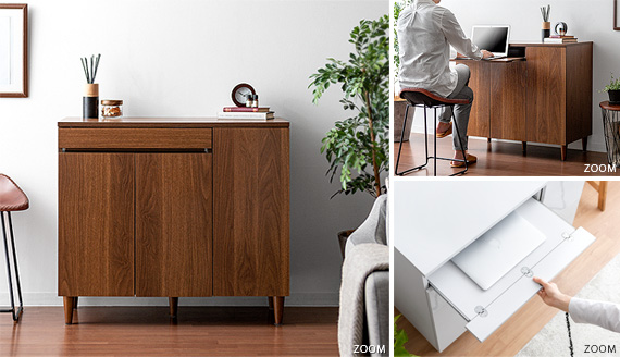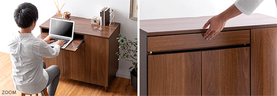 普段は見えないようにノートパソコンなどを収納。リビングに置いて、パソコン作業をしたい時にスライドトレーをサッと引きだせば快適なPCデスクに。
