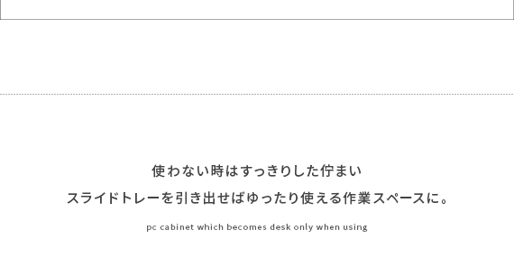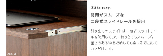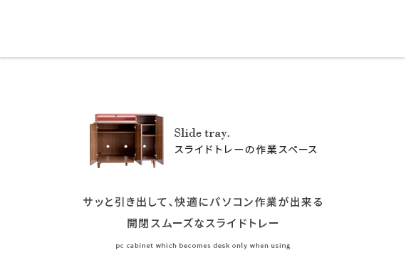 ノートパソコンなどを収納出来るスライドトレーを引きだすと、前板が倒れてフラットなスペースが広がりゆったりとした作業スペースとしてお使いいただけます。