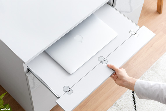 引き出しのスライドは二段式スライドレールを使用しており、動きとてもスムーズ。重さのある物を収納しても楽に引き出していただけます。