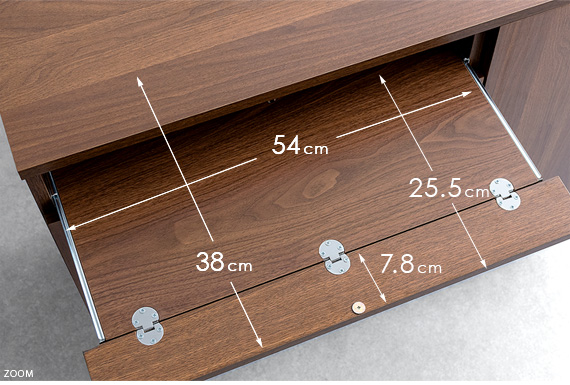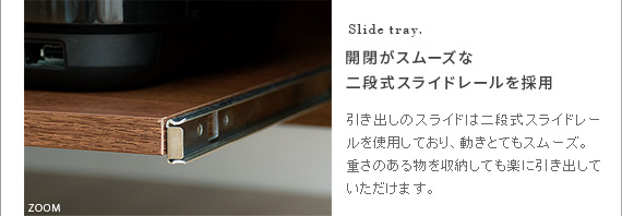 引き出しのスライドは二段式スライドレールを使用しており動きとてもスムーズ。重さのある物を収納しても楽に引き出していただけます。