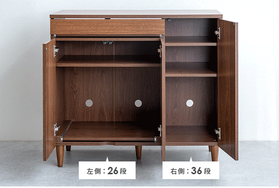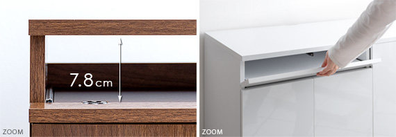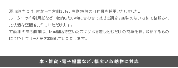 可動棚は約1cmピッチで高さ調節が可能。収納する物に合わせたちょうど良い高さで無駄のない収納をしていただけます。