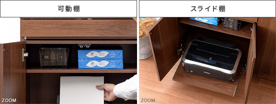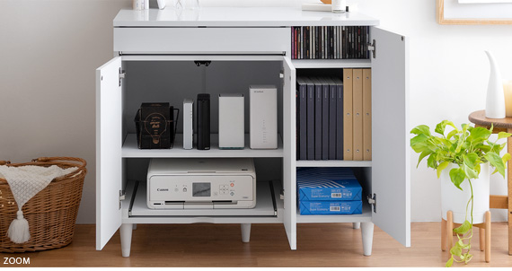 ルーターや印刷用紙など、収納したい物に合わせて高さを調節。無駄のない収納で整頓された快適な空間をお作りいただけます。