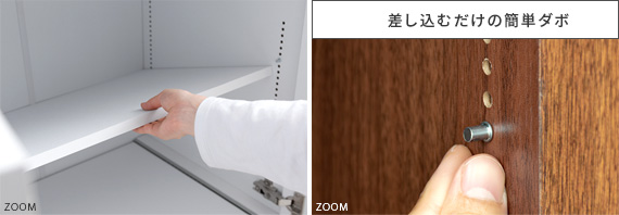 可動棚の高さ調節は、1cm間隔で空いた穴にダボを差し込むだけの簡単仕様。収納するものに合わせてサッと高さ調節していただけます。