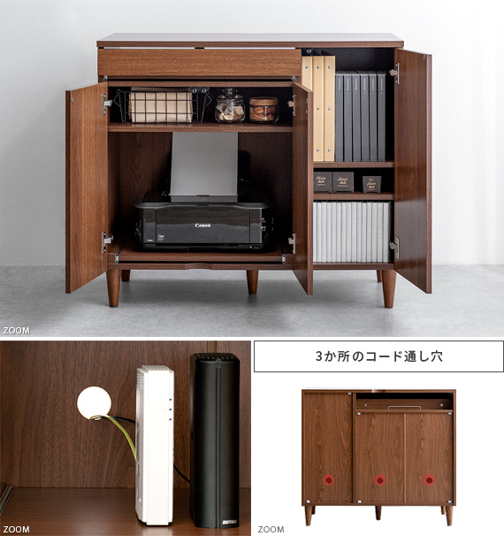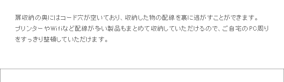 プリンターやWifiなど配線が多い製品もまとめて収納していただけるので、ご自宅のPC周りをすっきり整頓していただけます。