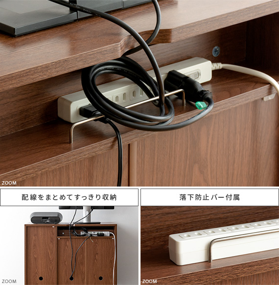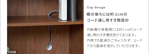 可動棚の背面側には約1cmのコード通し用のすき間を空けております。内側でも配線がごちゃつかず、コード穴から配線を逃がしていただけます。